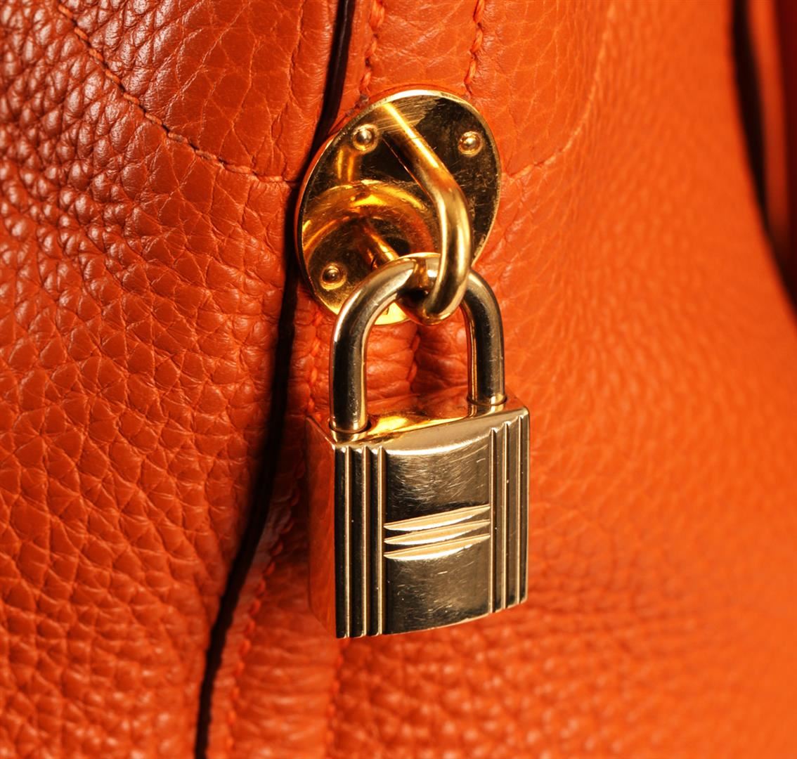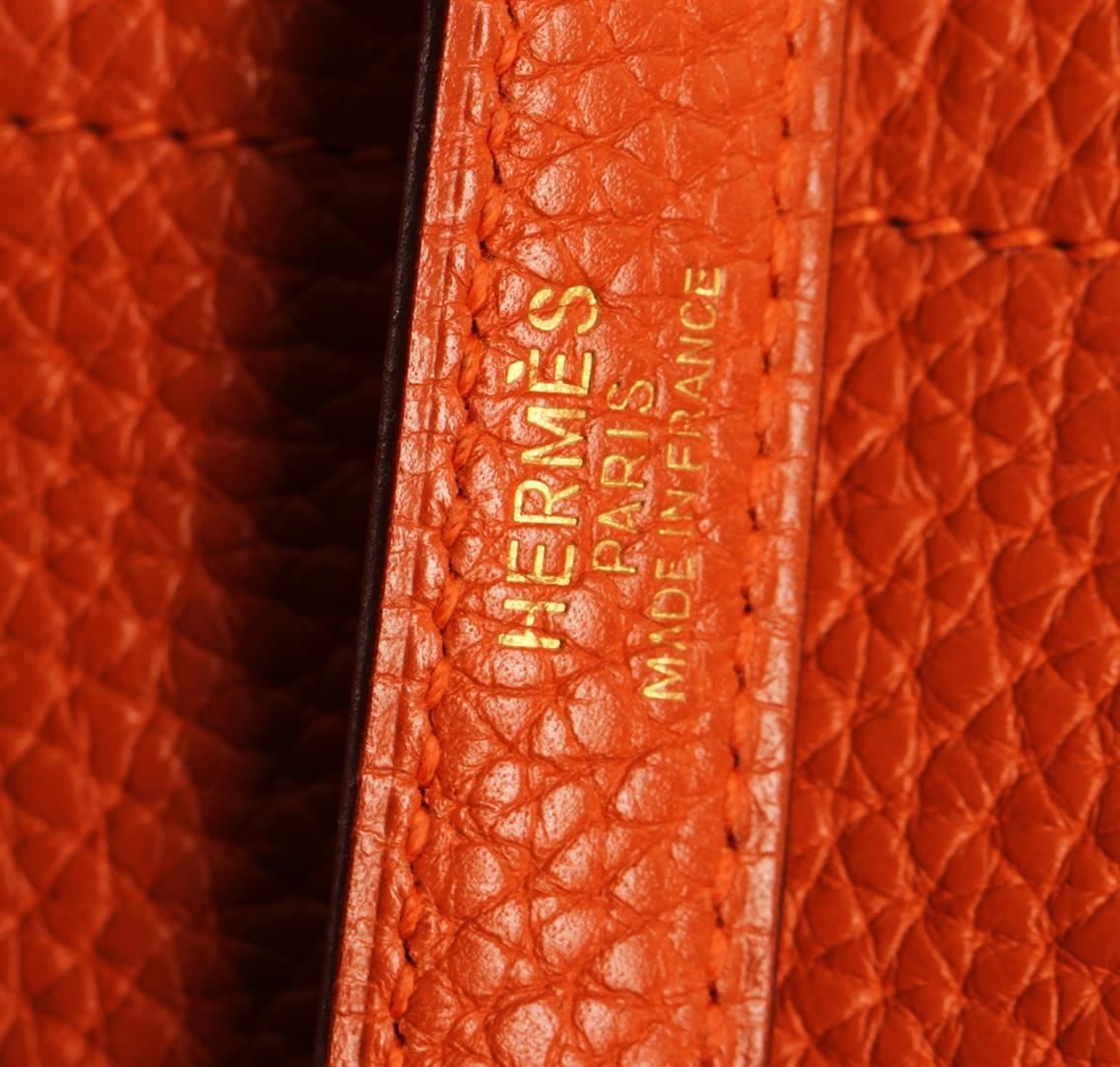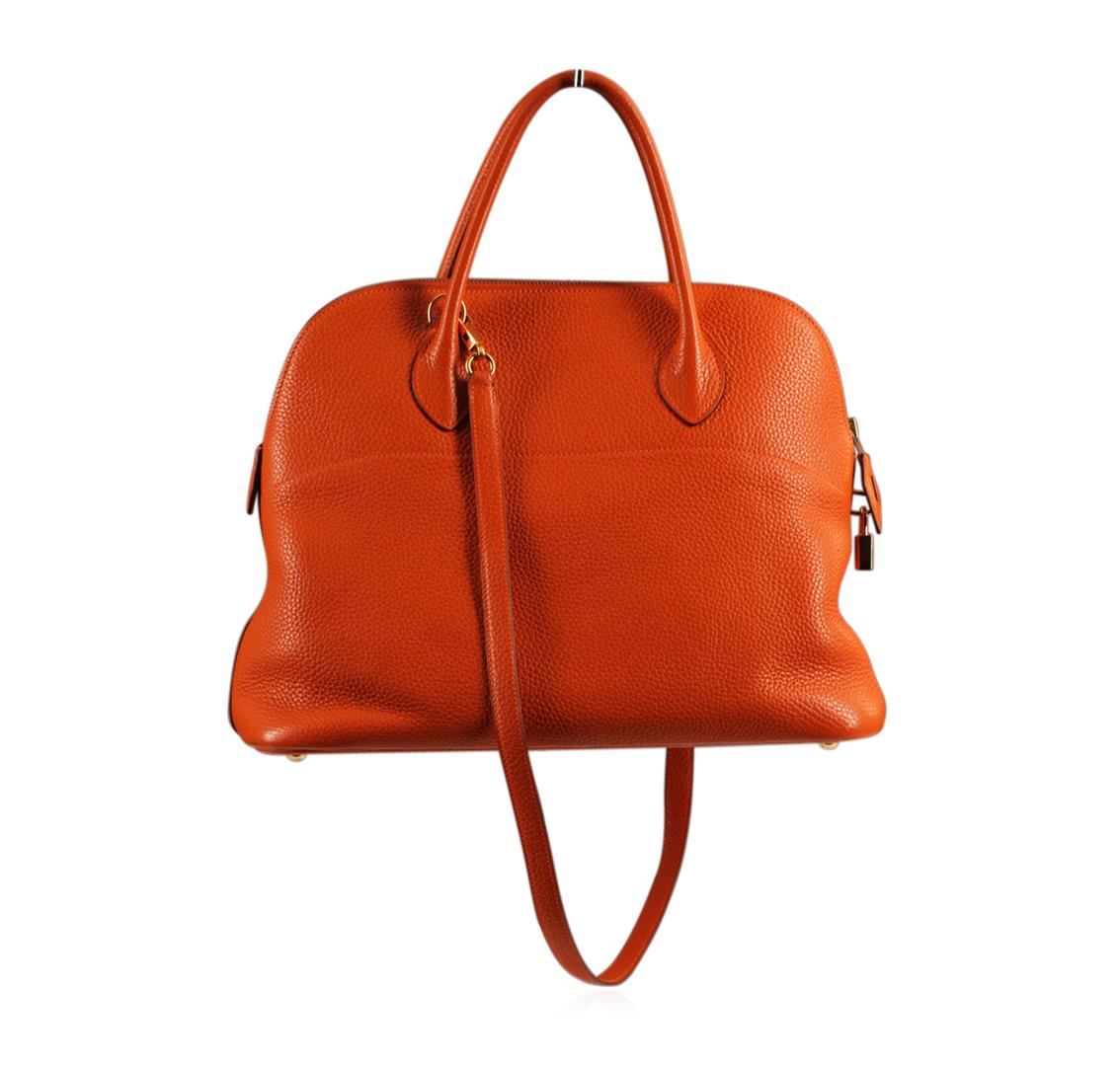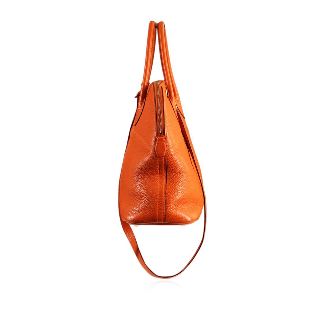 One Authentic Hermes Orange Togo Leather Bolide Bag. This beautiful Hermes Bolide features classic orange textured togo leather with gold tone hardware. This bag is in good condition but has slight wear on the inside of the bag. You can be sure to make a statement with a bright and beautiful bag like this! Measures approximately 14" wide x 10.5" tall with a 3.5" drop.