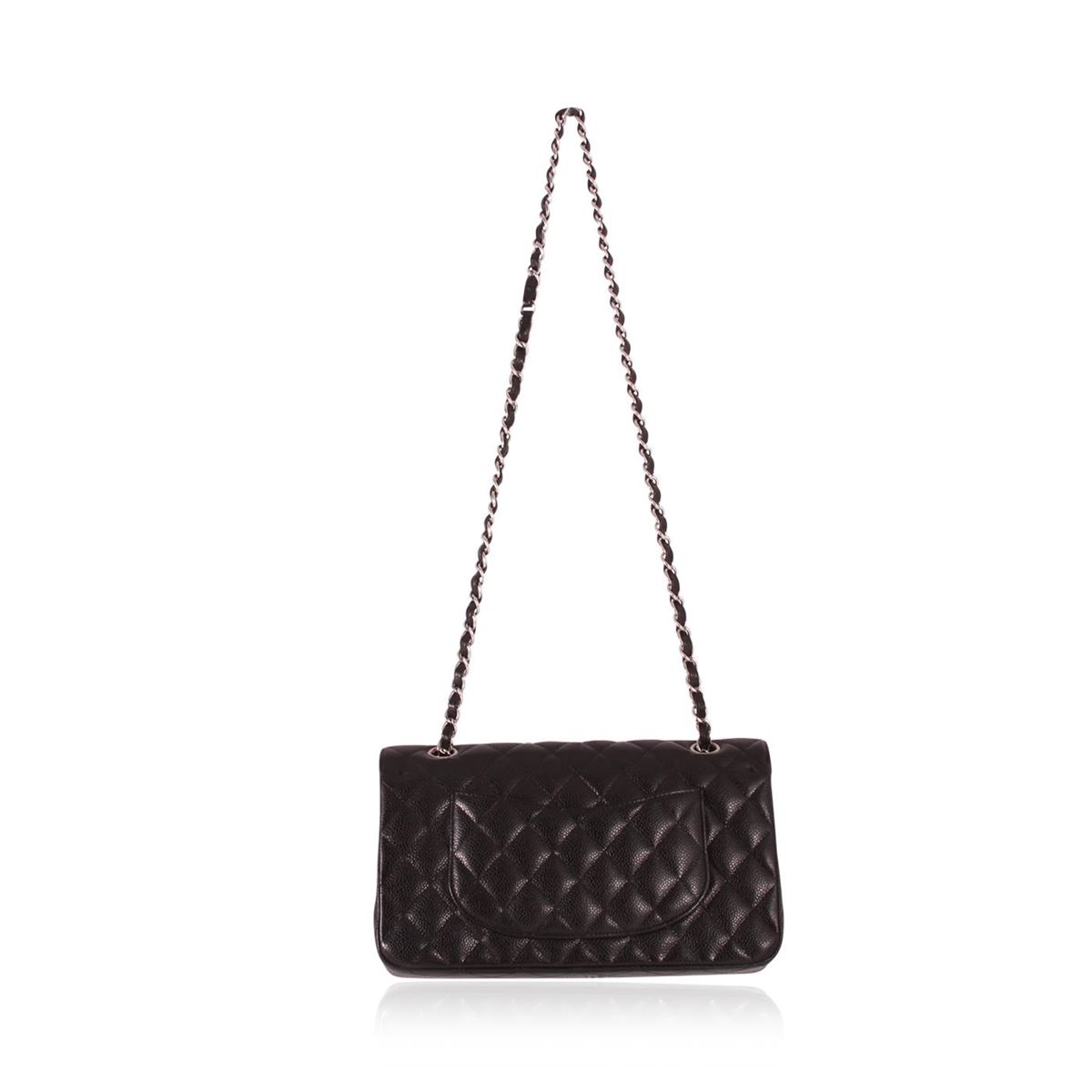 This is a stunning and 100% Authentic Chanel 2.55 Classic Flap Bag. This classic Chanel handbag is made from luxurious grained caviar leather with the all-over iconic quilting detail. Convertible chain allows for versatile wear; carry as a clutch with chains tucked in, wear as a shoulder bag with double chain or wear as a cross-body bag with the chain in the single extended position. This timeless Chanel bag is considered to be one of those always in style bags that looks great with any outfit and is every fashionistas dream! The inside of this bag is just as luxurious as the outside; completely lined with supple black leather and features several compartments perfect for organization and quick access. Please note that small zippered compartment is missing the zipper pull and can possibly be fixed but is inoperable at the moment. Most people would never even notice this as it is hidden underneath the main flap and does not stand out. This gorgeous Chanel bag is finished with silver toned hardware, a woven chain and leather strap and a silver Chanel Made in France logo stamped inside. Approximate dimensions in inches: 10 x 6 x 2.5 . Condition: Good vintage condition.