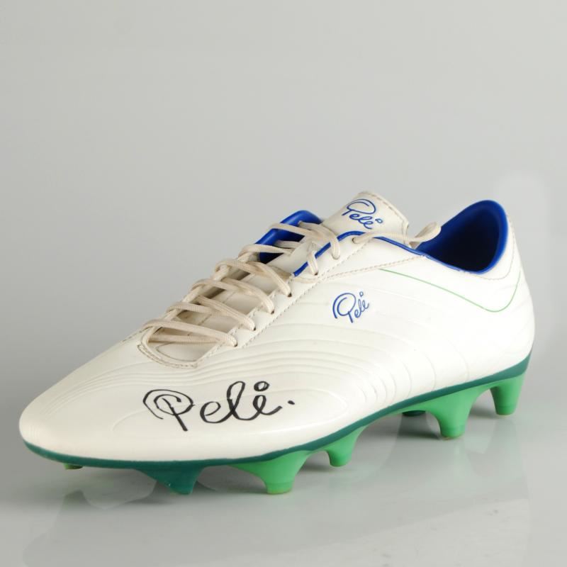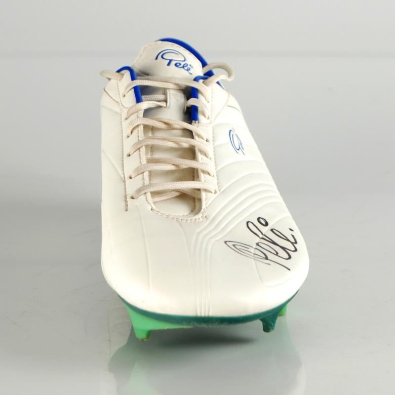 This is an autographed soccer cleat by legendary Brazilian footballer, Pele! This piece is presented with a Certificate of Authenticity from PSA/DNA, which authenticates sports memorabilia using proprietary permanent invisible ink as well as a strand of synthetic DNA. We make no additional warranties. Measures approx. 11" x 4" (cleat).