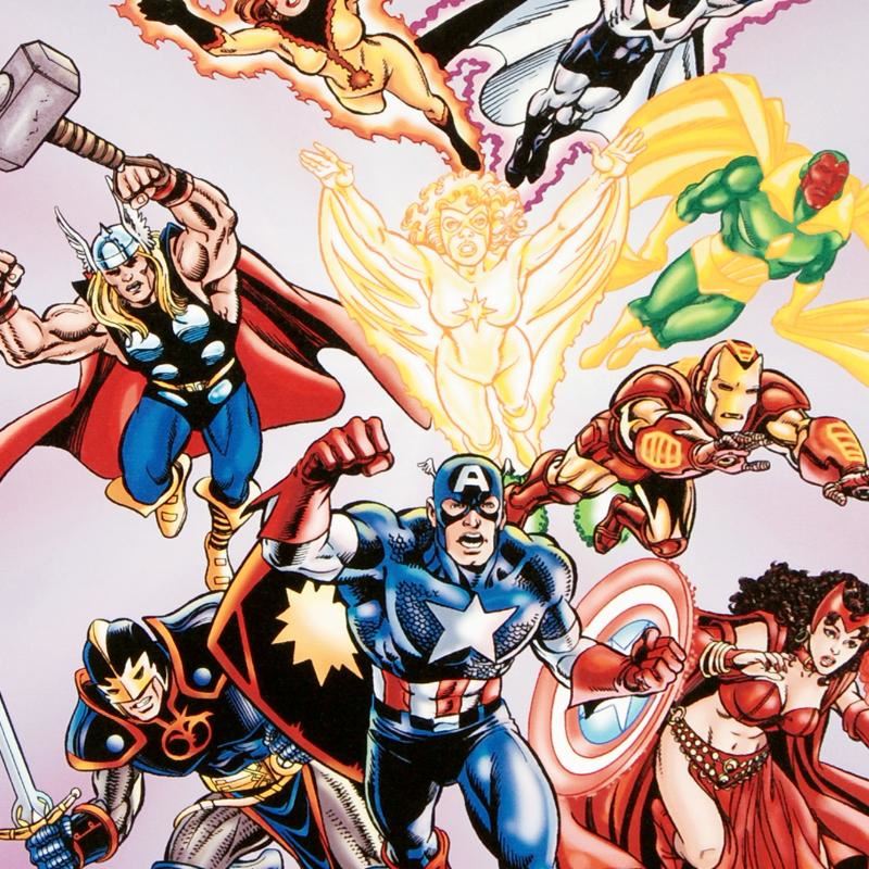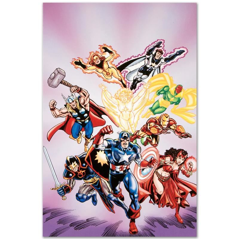 A piece of comic book history, this limited edition, from original art by Jerry Ordway, depicts Captain America, Scarlet Witch, Iron Man, Vision, Firestar, Thor, Justice, Firebird, and Swordsman. Jerry Ordway is an American writer, penciller, inker and painter of comic books. He is known for his inking work on a wide variety of DC Comics titles and for writing and painting the Captain Marvel original graphic novel 'The Power of Shazam!'. "Avengers #16" is a limited edition numbered giclee on stretched canvas by Jerry Ordway presented by Marvel Comics. This piece comes gallery wrapped. Includes Certificate of Authenticity! Measures approx. 18" x 27" (image); 1.5" (depth).