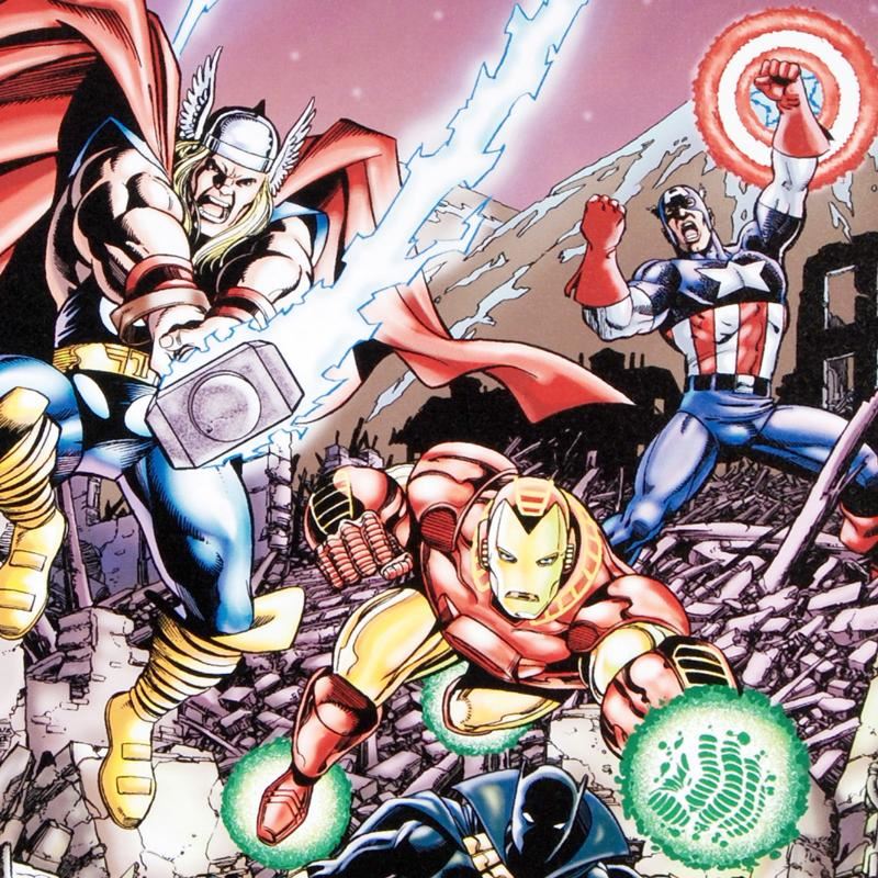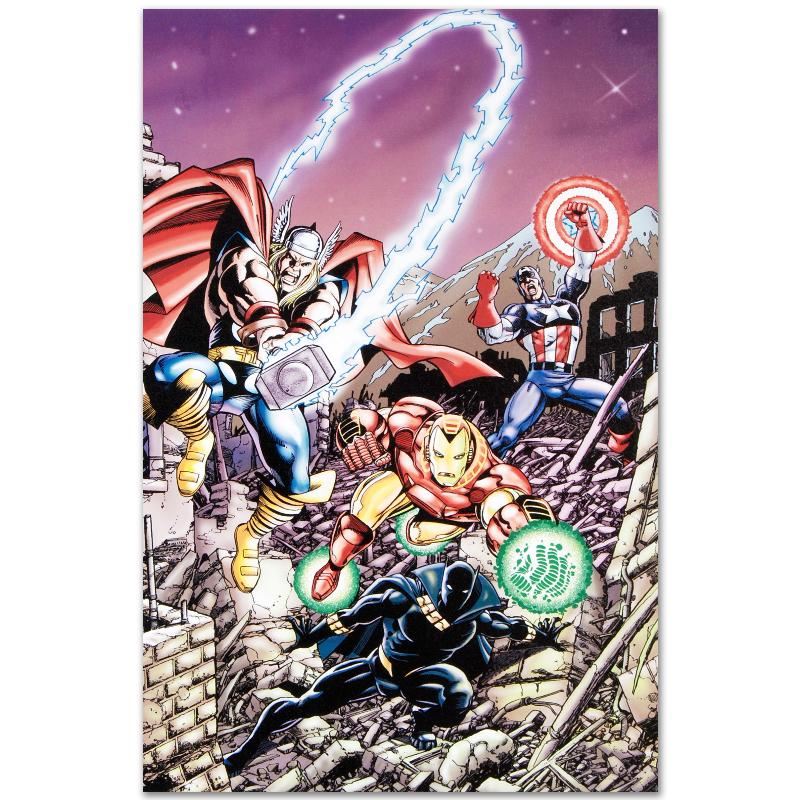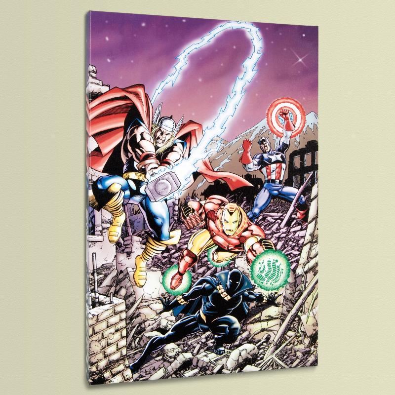 A piece of comic book history, this limited edition, from original art by George Perez, depicts the mighty Avengers. Puerto Rican artist George Perez gained renown within the industry by illustrating The Avengers in a style reminiscent of Jack Kirby. He has since illustrated many titles for both Marvel and DC Comics, including Hulk and X-Men. "Avengers #21" is a limited edition numbered giclee on stretched canvas by George Perez presented by Marvel Comics. This piece comes gallery wrapped and ready to hang. Includes Certificate of Authenticity! Measure approx. 18" x 27" (image); 1.5" (depth).