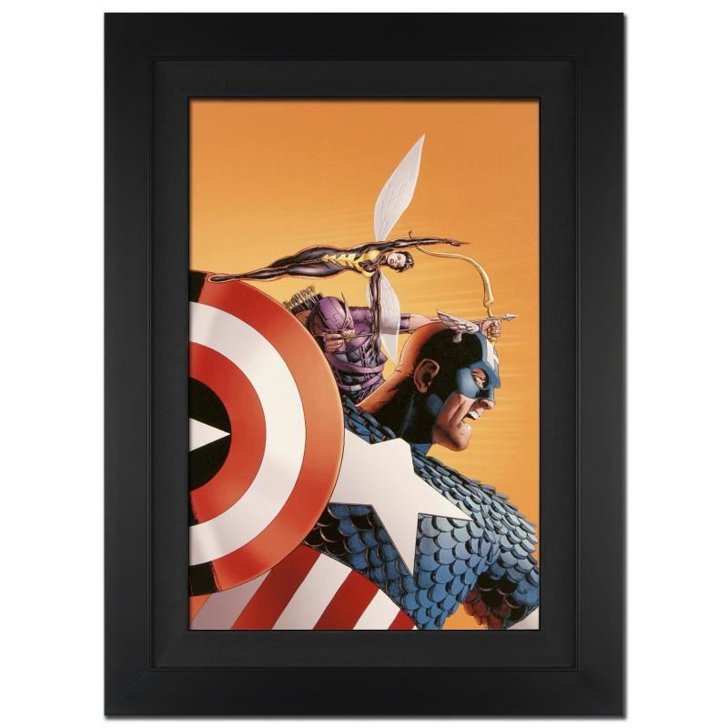 A piece of comic book history, this limited edition, from original art by John Cassaday, depicts Captain America, Hawkeye and Wasp. In 1997, shortly after his entrance into the world of comic book art, John Cassaday began to work Marvel Comics, working primarily on X-Men/Alpha Flight. He has also worked on Captain America, Secret War, and Union Jack. "Avengers #77" is an extremely limited edition giclee on canvas by John Cassaday presented by Marvel Comics, hand signed by the great Stan Lee and numbered out of only 10! This piece was custom framed and ready to hang. Includes Certificate of Authenticity! Measure approx. 25" x 34" (with frame), 18" x 27" (image).