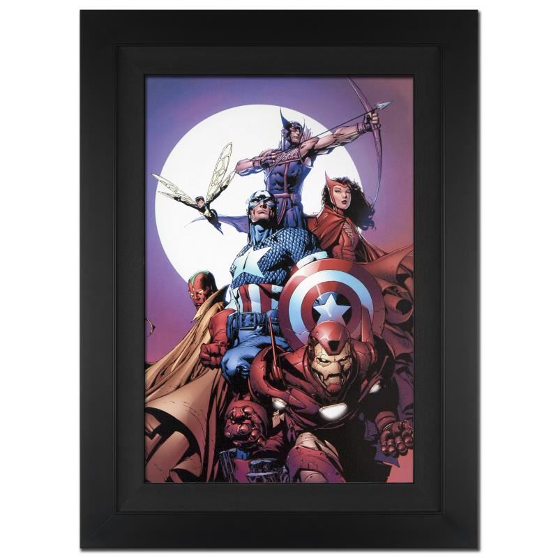 A piece of comic book history, this limited edition, from original art by David Finch, depicts Captain America Iron Man, Scarlet Witch, Vision, Hawkeye, and Wasp. In 2003, Finch came to Marvel Comics for a year-long arc on Ultimate X-Men, after which he began work on The Avengers and thereafter The New Avengers. He has also worked on such titles as Captain America, Spider-Man and the Hulk. "Avengers #80" is an extremely limited edition giclee on canvas by David Finch presented by Marvel Comics, hand signed by the great Stan Lee and numbered out of only 4! This piece comes custom framed and ready to hang. Includes Certificate of Authenticity! Measures approx. 29" x 40" (with frame); 22" x 33" (image).