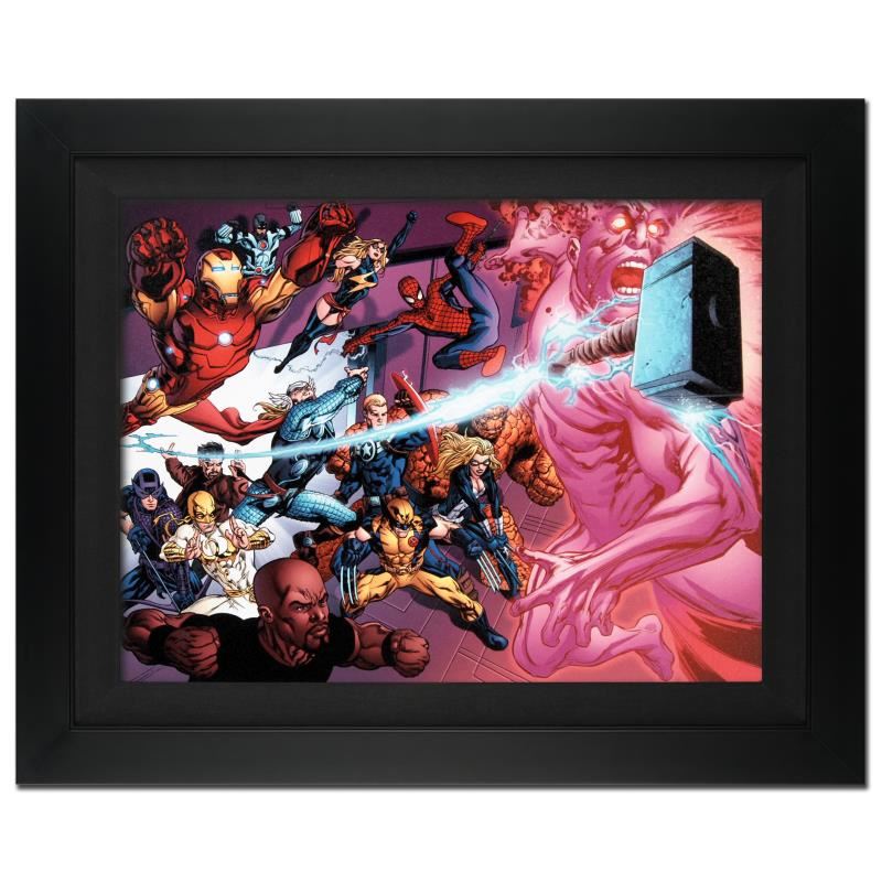 A piece of comic book history, this limited edition, from original art by Tom Raney, depicts an epic battle of Marvel characters. Tom Raney is an American comic book artist, known for illustrating titles as Annihilation Conquest, Alpha Flight, Ultimate X-Men and Uncanny X-Men for Marvel Comics, DV8 and Stormwatch for Image Comics, and Outsiders for DC Comics. "Avengers Academy #11" is an extremely limited edition giclee on canvas by Tom Raney presented by Marvel Comics, hand signed by the great Stan Lee and numbered out of only 4! This piece is custom framed and ready to hang. Includes Certificate of Authenticity! Measures approx. 40" x 29" (with frame), 33" x 22" (image).