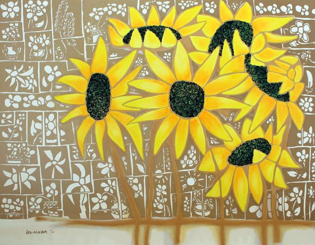 Avi Ben-Simhon Golden Wonder. Artist: Avi Ben-Simhon - Title: Golden Wonder - Medium: Serigraph on Canvas - Signature: Hand-signed by the Artist - Edition: DLX 145 - Image Size: Approximately 35 inches x 47 inches - Unframed - Details: This work comes with a Certificate of Authenticity - Biography: Avi Ben-Simhon has been deeply inspired by Fauvist and Cubist painters, while creating his signature, unmistakable style. The element of design is strongly developed in his work, in composition and pallet, while the dramatic shapes and vibrant colors powerfully express his joie de vivre. His spiral-like motifs echo his Moroccan roots, each pattern forming an exceptional design in bright and effervescent colors.