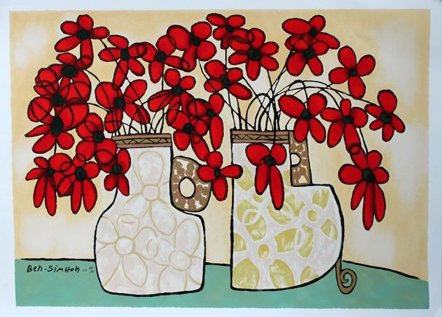 Avi Ben-Simhon Red Flowers. Artist: Avi Ben-Simhon - Title: Red Flowers - Medium: Serigraph on Paper - Signature: Hand-signed by the Artist - Edition: 390 - Image Size: Approximately 26 inches x 36 inches - Paper Size: Approximately 28 ¼ inches x 38 ¾ inches - Unframed - Details: This work comes with a Certificate of Authenticity - Biography: Avi Ben-Simhon has been deeply inspired by Fauvist and Cubist painters, while creating his signature, unmistakable style. The element of design is strongly developed in his work, in composition and pallet, while the dramatic shapes and vibrant colors powerfully express his joie de vivre. His spiral-like motifs echo his Moroccan roots, each pattern forming an exceptional design in bright and effervescent colors.
