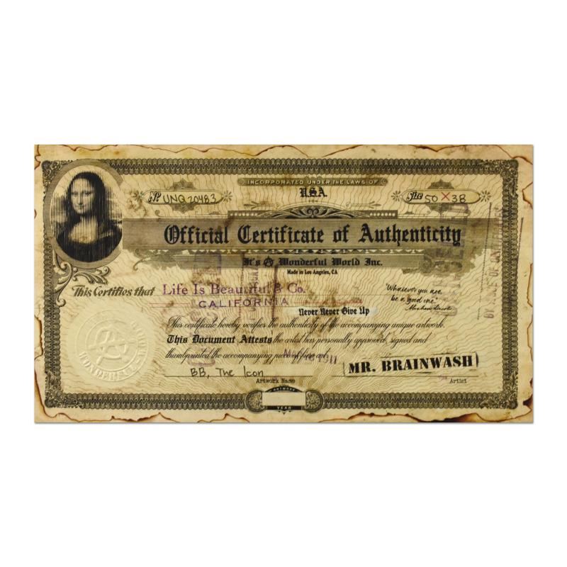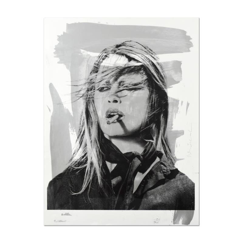 "BB (Bridgitte Bardot)" is a silkscreen acrylic overpaint on deckle edge paper by Mr. Brainwash, hand signed by the artist. This piece is numbered 1/1 and bears the thumbprint of the artist inverso. Includes Certificate of Authenticity. Measures approx. 38" x 50" (image).