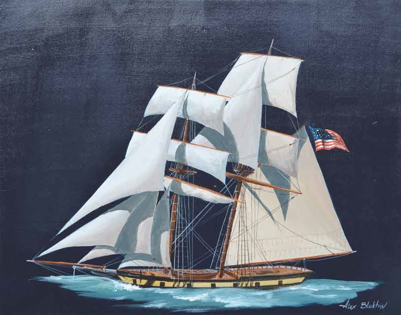 BLOKHIN ** BALTIMORE CLIPPER** ORGINAL ACRYLIC . Artist: Alexander Blokhin (b.1971) - Title: Baltimore Clipper - Medium: Acrylic on Canvas - Signature: This one-of-a-kind work is hand-signed by the artist at the bottom of the image - Image Size: Approximately 16 inches x 20 inches - Biography: Alexander Blokhin was born in Minsk in 1971 and he graduated the MAST (Minsk Architectural College) - in the specialty "Architecture" and studied at the Architectural Academy in Minsk. In 1998 he began working with the National Maritime Museum in Haifa, Israel.For several years, has built more than 25 models of ships of various historical periods. - His models are placed on permanent display. He was the organizer of 3 shows of the scale models of ships at the National Maritime Museum in Israel and has worked with the Museum of Science and Technology, the City Museum and others. Today, he still works closely with museums in Germany, Cyprus and the United States. From 2005 to present, he is the curator of "Maritime Heritage Center" at the company CORAL MS. - Warranty: Item GUARANTEED to be as described