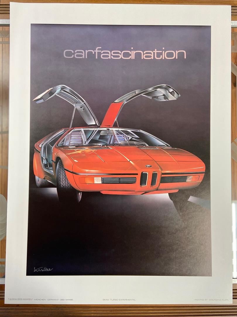 A hand-signed color Advertising Poster by Wolfgang Kuzel, 25.5 x 23.5", of the famous gull-winged BMW Turbo. Signed by Kuzel. Not been framed.