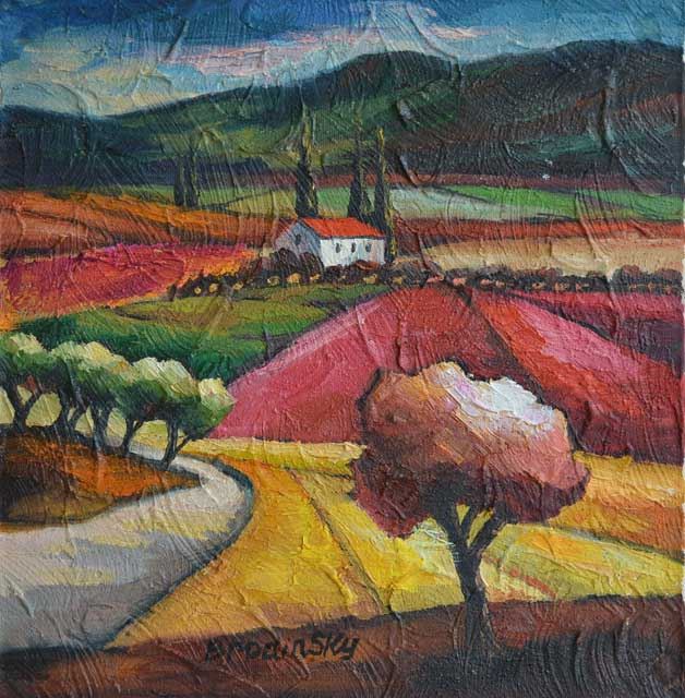 BRODINSKY ** THE DEEP VALLEY ** ORIGINAL ACRYLIC. Artist: Slava Brodinsky (b. 1955) - Title: The Deep Valley - Medium: Acrylic on Canvas - Signature: This one-of-a-kind work is hand-signed by the artist at the bottom of the image - Image Size: Approximately 15 ¾ inches x 15 ¾ inches - Framed: Unframed on Unstretched Canvas - Details: This work comes with a Certificate of Authenticity - Biography: Born in Birobidjan, Eastern Russia, in 1955, Brodinsky devoted himself to painting from an early age. As a boy, he was sent to an art school, and after serving in the Soviet Army, returned to his hometown and began studying in the Fine Arts Academy of Birobidjan, graduating with honors in 1979. Through the eighties he continued painting monumental works and participated in exhibitions throughout the U.S.S.R. - In 1991 Brodinsky immigrated with his family to Israel. The topography of the country, especially the views of the Galilee in Northern Israel and its surrounding hills, became dominant motifs in his work. A different kind of sunlight and a new countryside affected his pallet and demarked a new period in his artistic history. - Brodinsky's work is exhibited and collected throughout the United States, Canada, Israel, Russia, France, England and Japan. He has had various one-man and group exhibitions in Israel and abroad. - Warranty: Item GUARANTEED to be as described