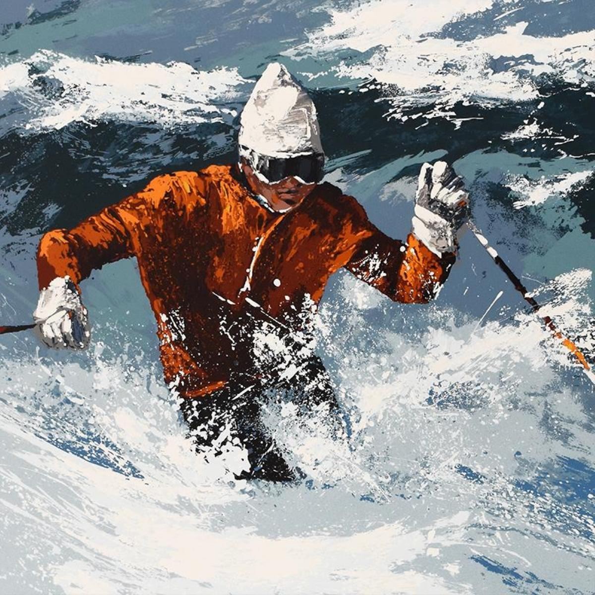 "Back Bowls Skier" is a limited edition serigraph on paper by Mark King (1931-2014), numbered and hand signed by the artist. Includes Letter of Authenticity. Measures approx. 45" x 35" (border), 40" x 30" (image). ** Please note: due to the age of this piece there are stains in the white border area. **