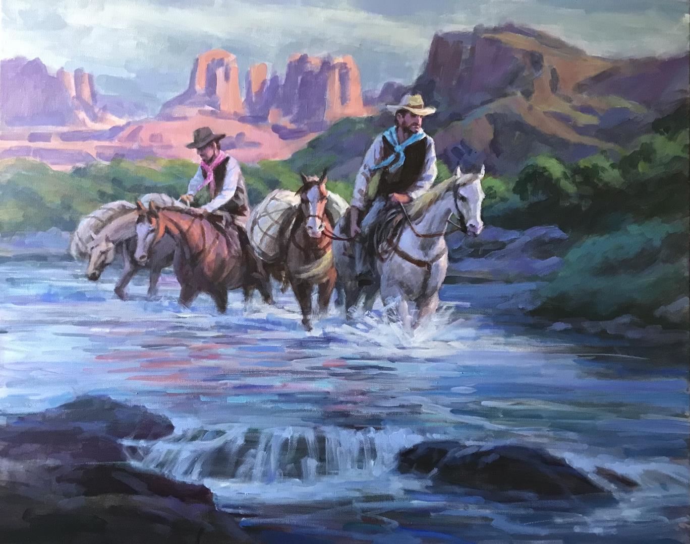 Two riders return from a trading trip in northern Arizona. A 24x30" acrylic original on stretched canvas by Richard Ho. COA