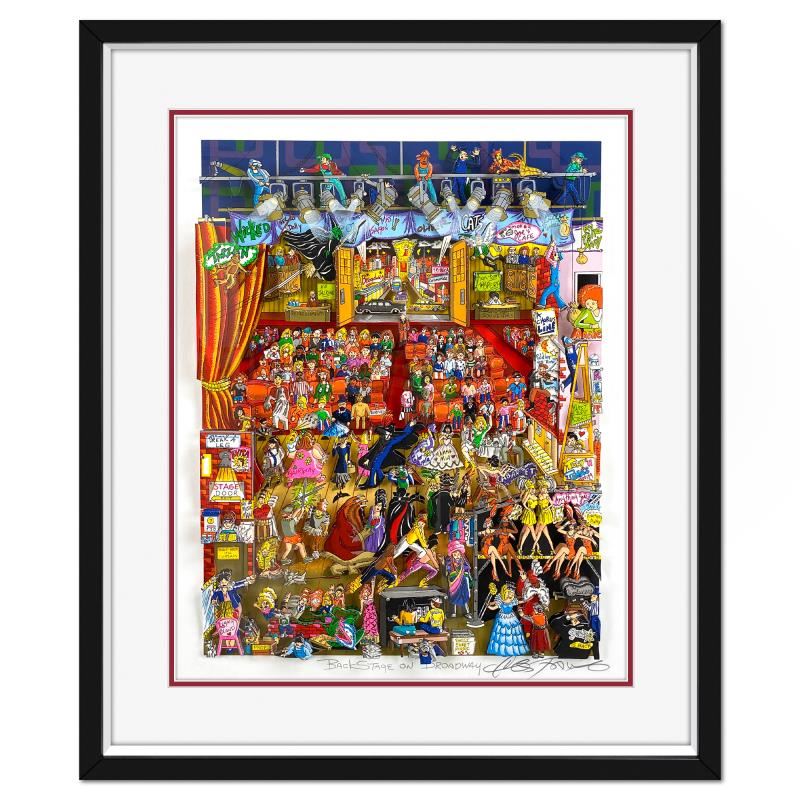 "Backstage on Broadway" is a 3D limited edition silk screen construct on paper by Charles Fazzino DX numbered and hand signed by the artist. This piece comes custom framed. Includes Certificate of Authenticity. Measures approximately 27.5" x 23" (frame) 19" x 14.5" (image).
