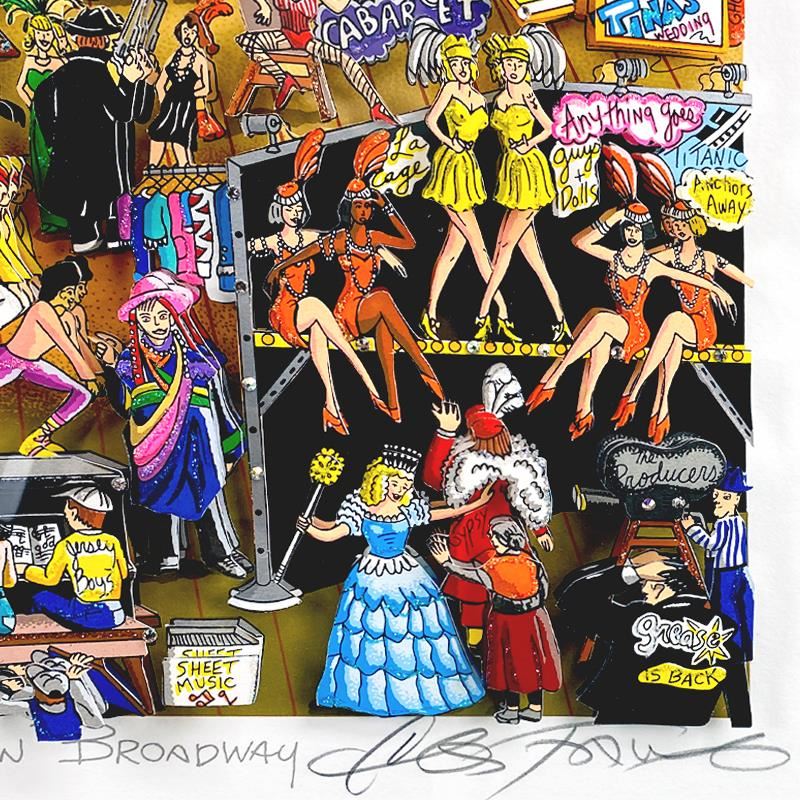 "Backstage on Broadway" is a 3D limited edition silk screen construct on paper by Charles Fazzino DX numbered and hand signed by the artist. This piece comes custom framed. Includes Certificate of Authenticity. Measures approximately 27.5" x 23" (frame) 19" x 14.5" (image).