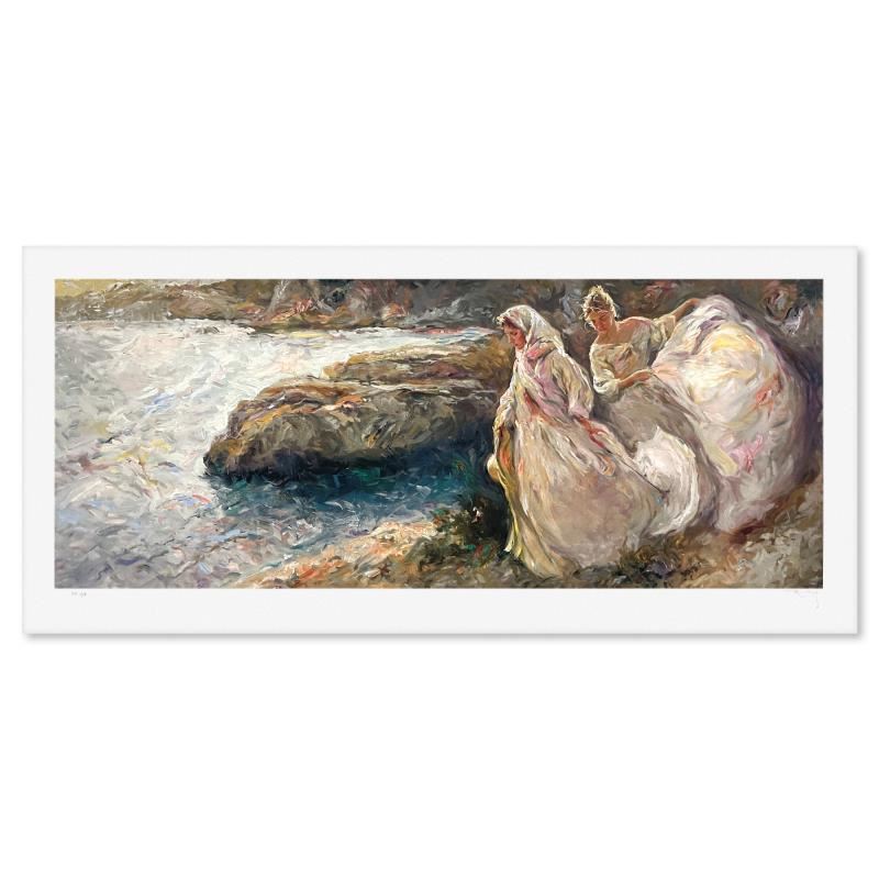 "Bajando Hacia El Mar" is a limited edition printer's proof serigraph on paper by Royo, numbered 1/8 and hand signed by the artist. Includes Letter of Authenticity. Measures approx. 22.5" x 50" (border), 18" x 44.5" (image).