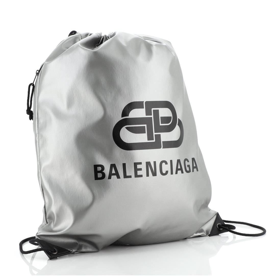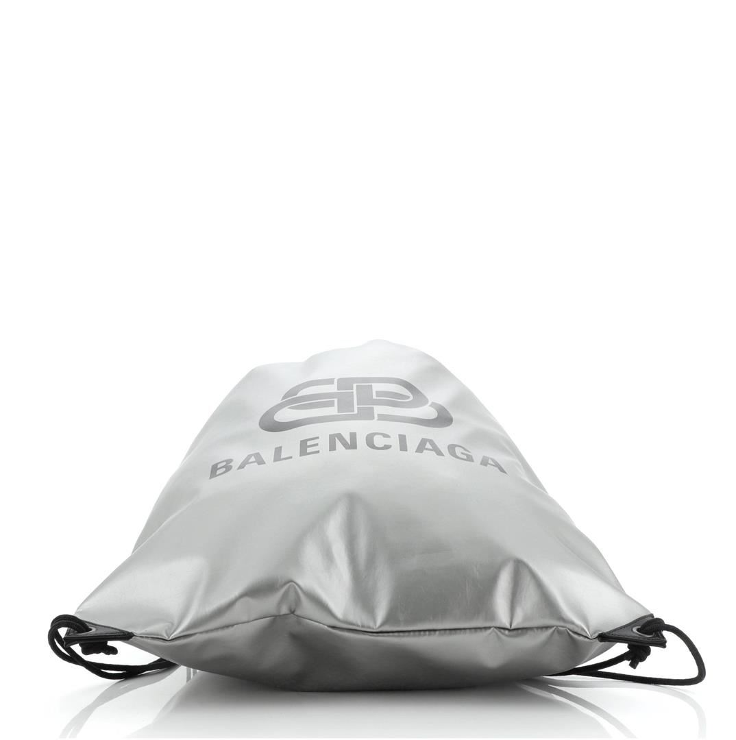 One Balenciaga BB Explorer Drawstring Backpack Nylon Silver. Item is sold AS-IS. All available information is listed in the description and shown in the photo. Balenciaga BB Explorer Drawstring Backpack Nylon Silver Nylon Condition Details: Indentations and scuffs on exterior, scratches on hardware. Height 19.5", Width 16", Depth 0.5", Strap Drop 14