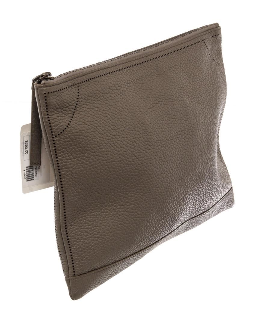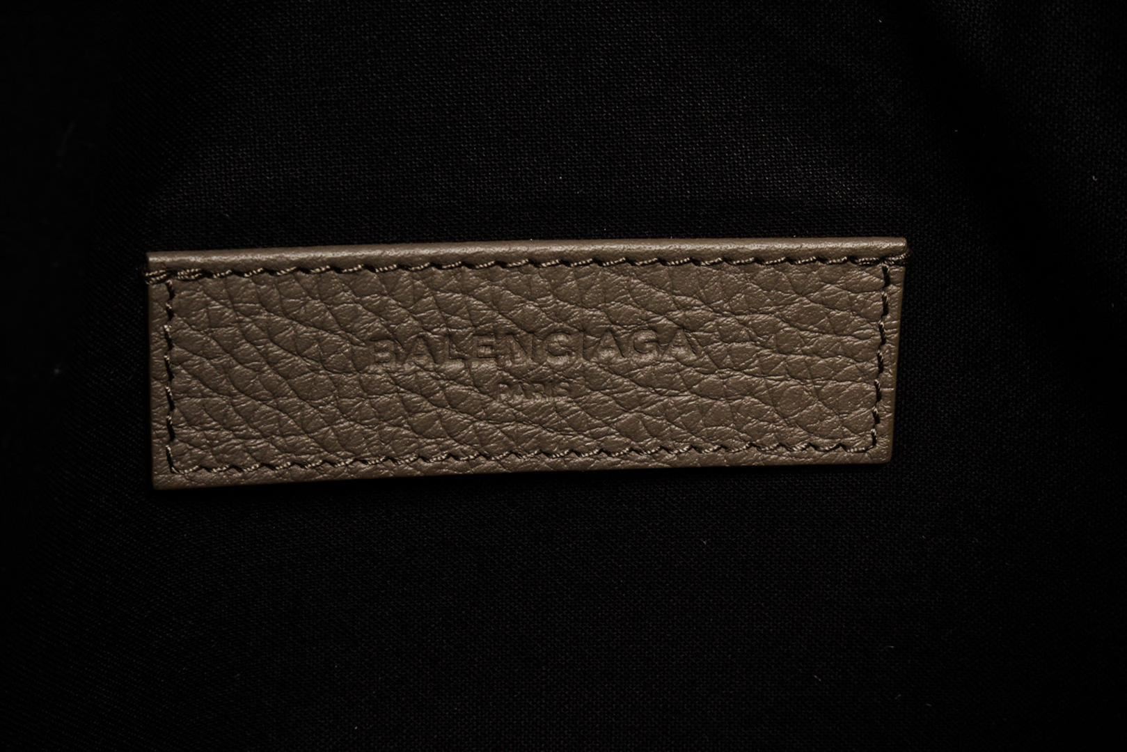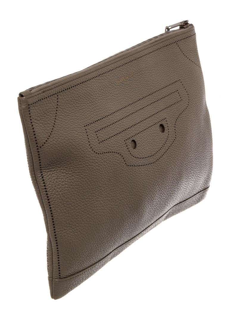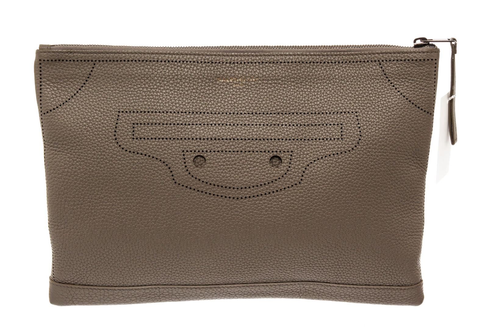 Beige leather Balenciaga pouch with palladium hardware, black leather trim, black canvas lining interior, single slit pocket at interior wall and zip closure at top. 13" x 0.5" x 9"/33cm x 1.3cm x 22.8cm