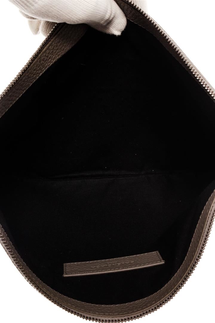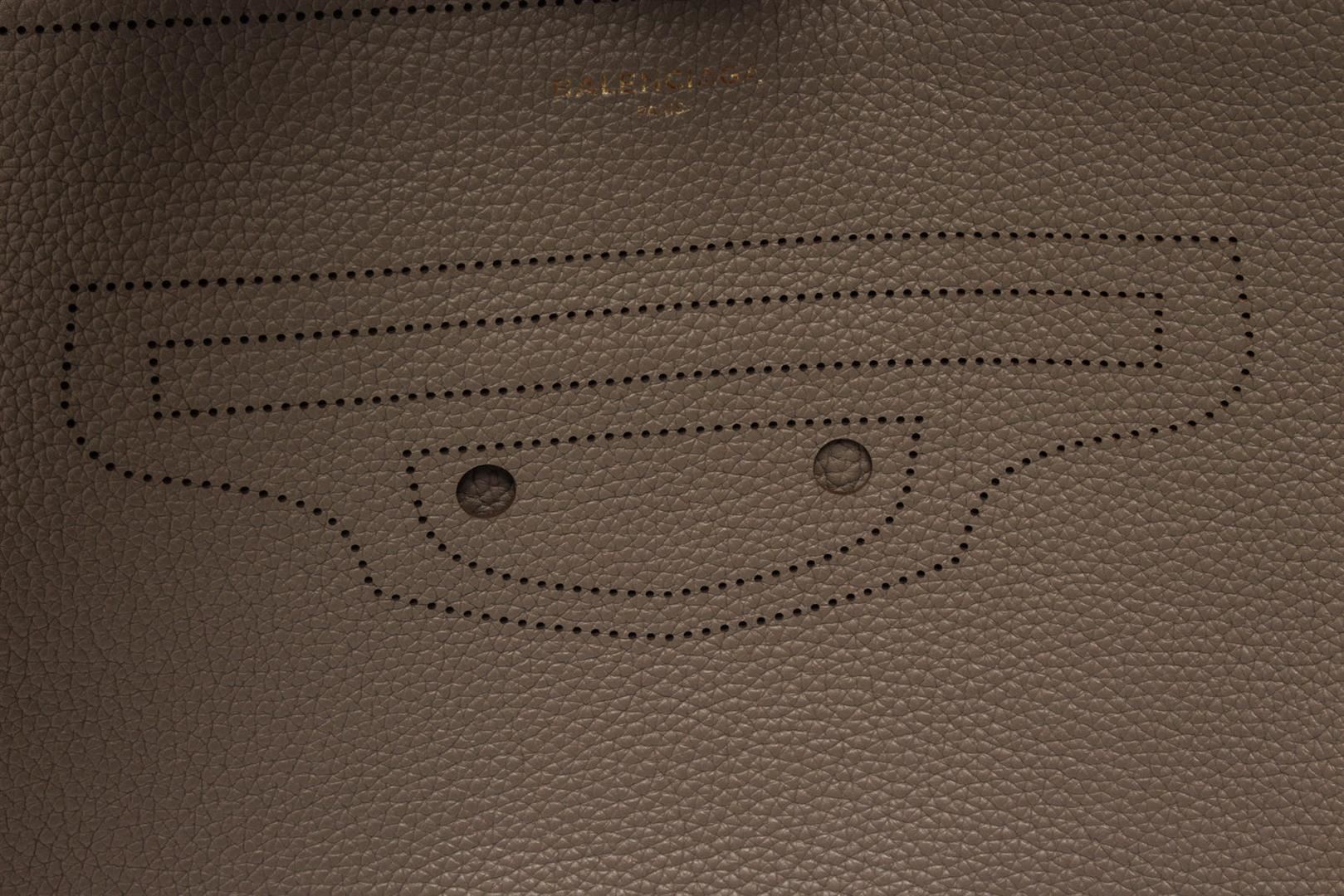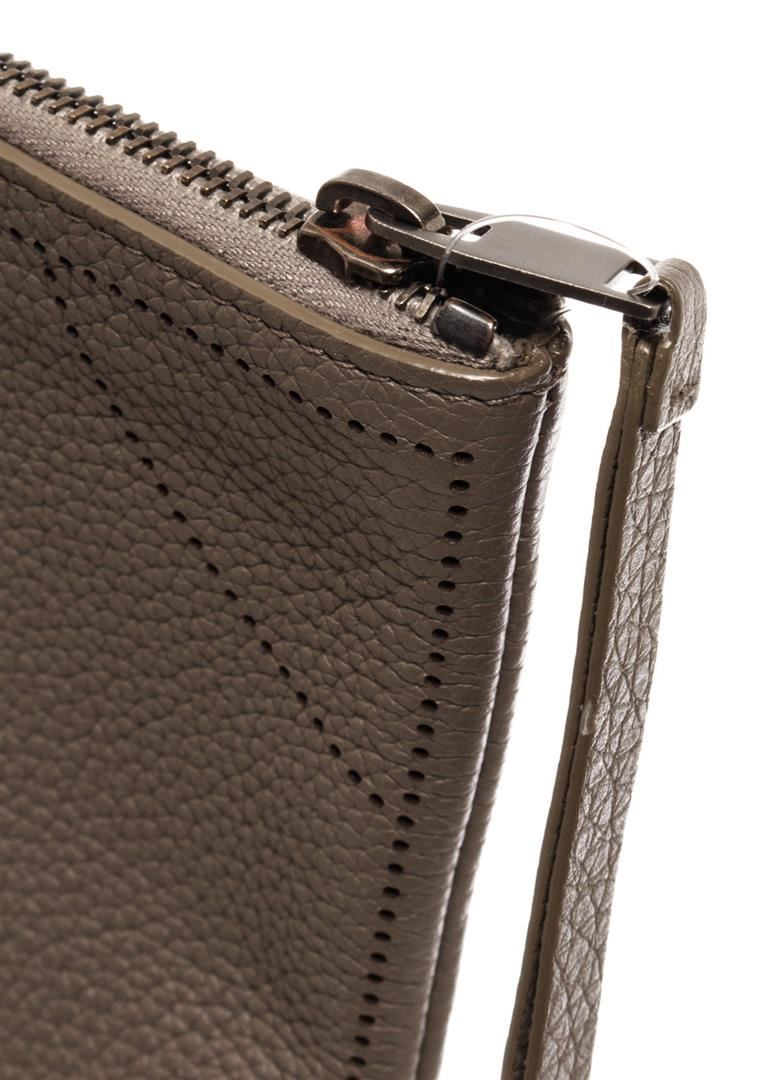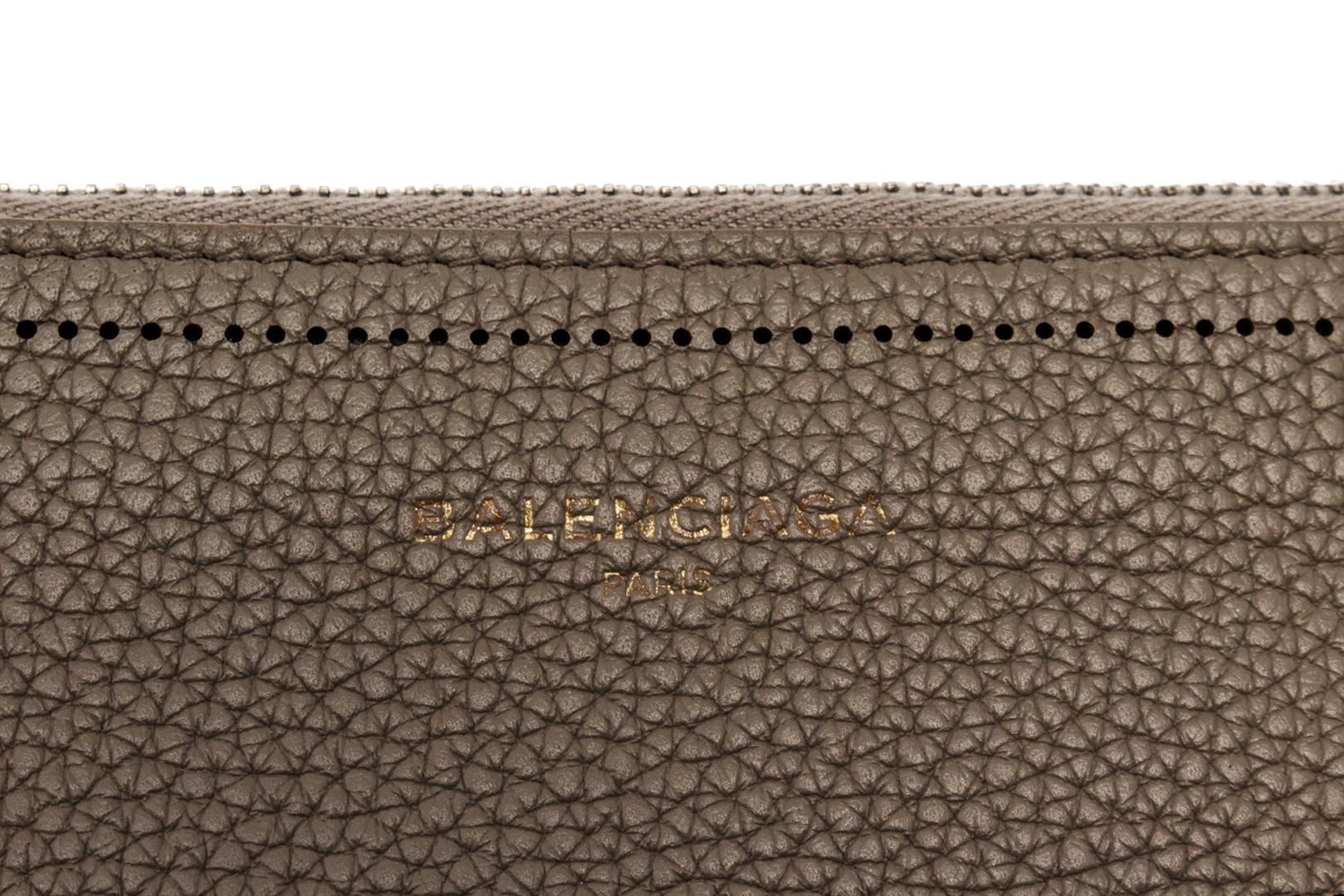 Beige leather Balenciaga pouch with palladium hardware, black leather trim, black canvas lining interior, single slit pocket at interior wall and zip closure at top. 13" x 0.5" x 9"/33cm x 1.3cm x 22.8cm