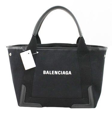 One Balenciaga Black Canvas Navy Cabas Small Tote Bag. Item is sold AS-IS. All available information is listed in the description and shown in the photo. Black canvas and black Calfskin leather Balenciaga Navy Cabas small tote bag with the Balenciaga signature on the front, including ??Paris??. It comes with an internal pouch, silver-tone hardware and there is a large compartment to store everything you need. The bag opens and closes with press studs, carry it with two handles. Length 29cm Width 17.5cm Height 23.5cm, Handles Drop: 14cm