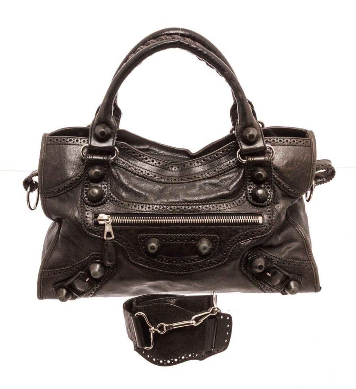 Balenciaga Black City Shoulder Bag. Balenciaga Black City Shoulder Bag with gold-tone hardware, trim leather, exterior zip pocket, top handle, shoulder strap and zipper closure. MEASUREMENTS: Length 9.5 in / 24 cm Width 14.5 in / 37 cm Height 5.5 i