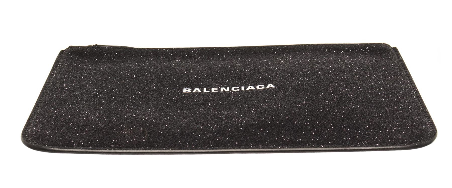 One Balenciaga Black Glitter Leather Logo-Print Zipped Clutch. Item is sold AS-IS. All available information is listed in the description and shown in the photo. Black leather logo-print leather clutch bag from Balenciaga with silver-tone hardware, white logo print to the front, grained texture, top zip fastening, main compartment, internal slip pocket, black leather lining and internal logo stamp. 12.6"x8.7"x0.2" height 9; width 13,3 depth 0,3 inc