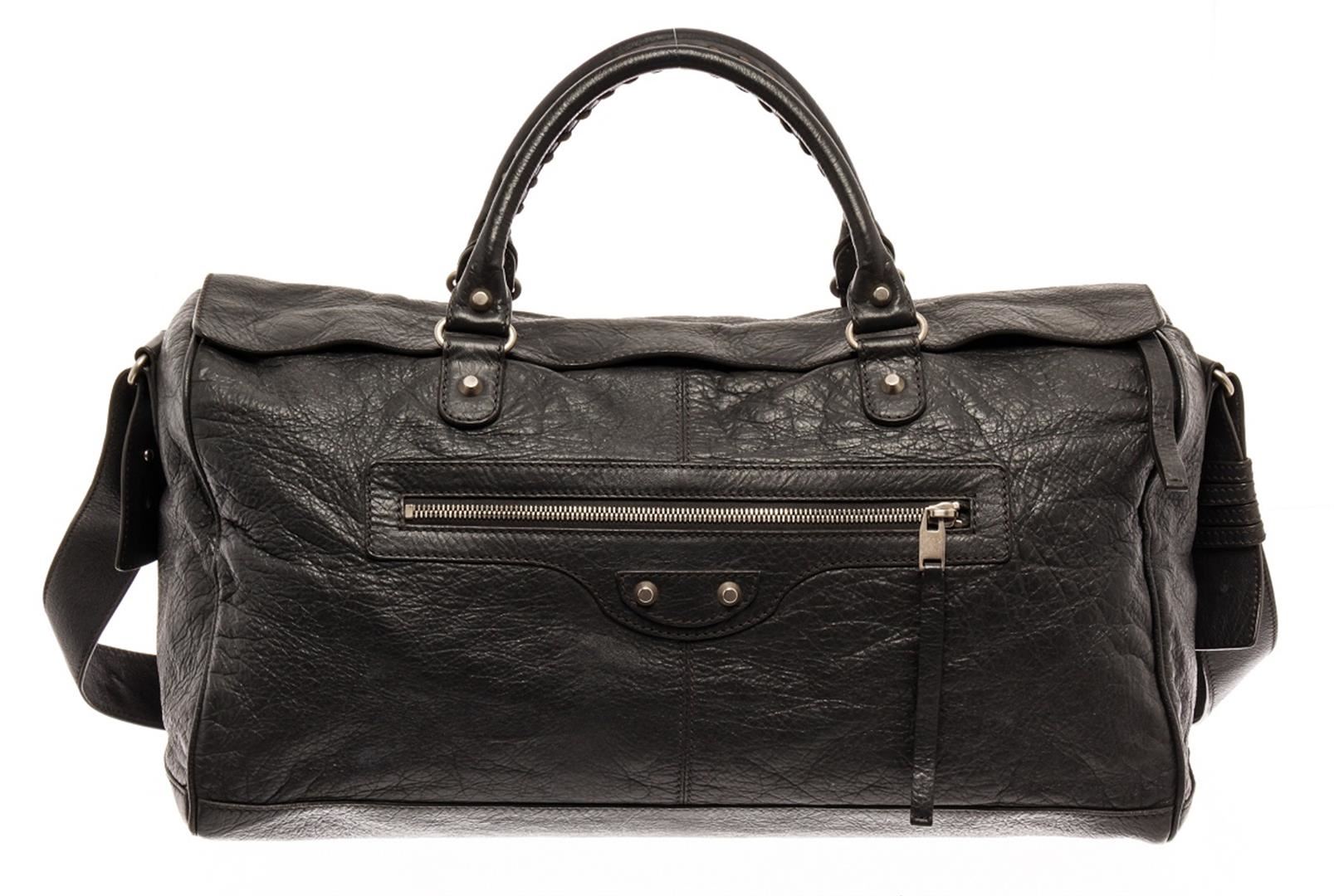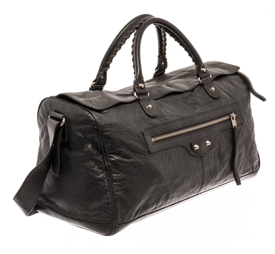 Balenciaga Black Leather Motocross Classic Squash Two Way Shoulder Bag. All available information is listed in the description and shown in the photos. Balenciaga Black Leather Motocross Classic Squash Two Way Shoulder Bag with silver-tone hardware, optional flat shoulder strap, dual rolled handles featuring whipstitching, buckle and stud embellishments at front face, single exterior zip pocket, black woven lining, three pockets at interior walls; one with zip closure and zip closure at top with additional magnetic closures at top flap. Height: 9" Width: 17.5" Depth: 8.5", Handle Drop: 5.5", Shoulder Strap Drop: 17.5" / 22.86 x 44.45 x 21.59 Cm