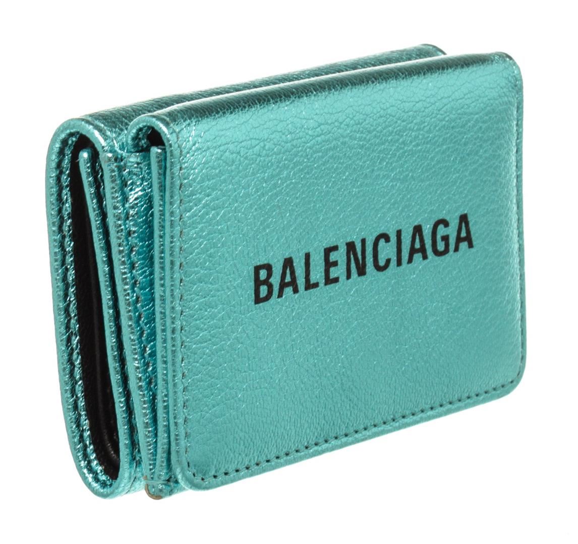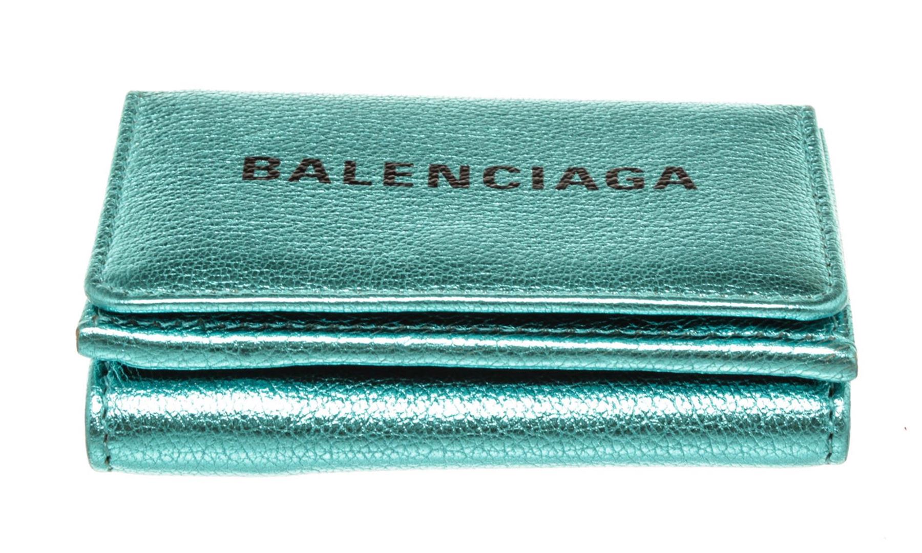 One Balenciaga Blue Leather Logo Trifold Wallet. Item is sold AS-IS. All available information is listed in the description and shown in the photo. Balenciaga Blue Leather Logo Trifold Wallet with leather, gold-tone hardware, interior card holder pocket and snap closure.