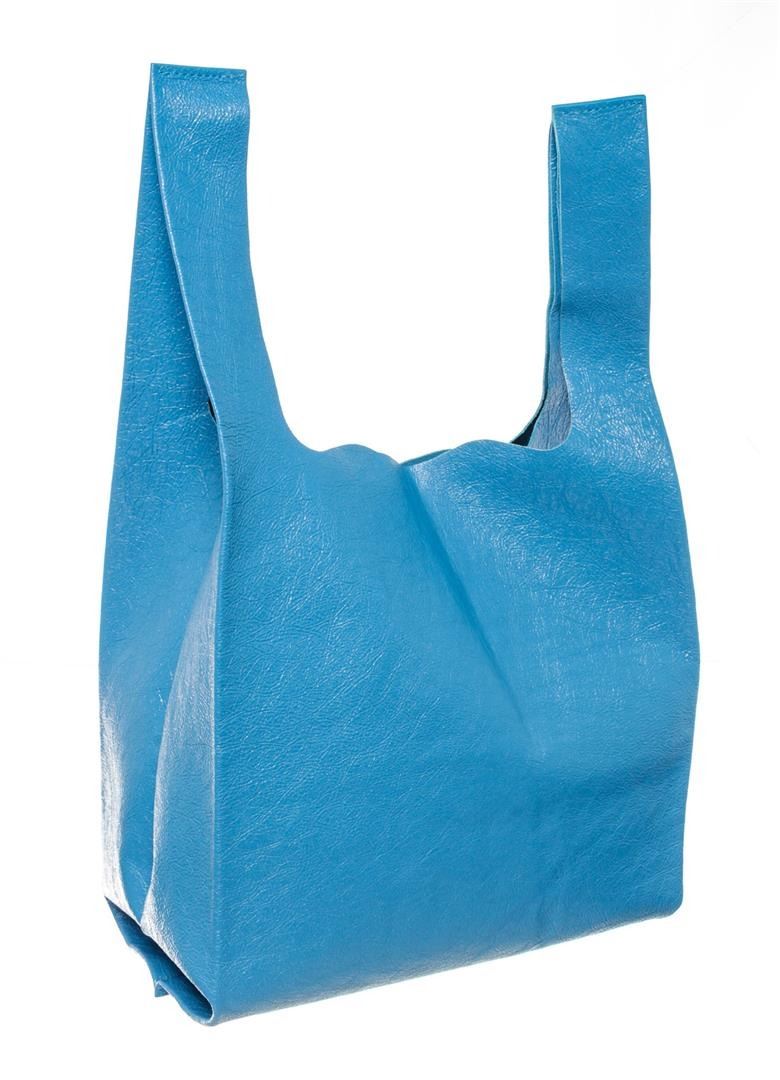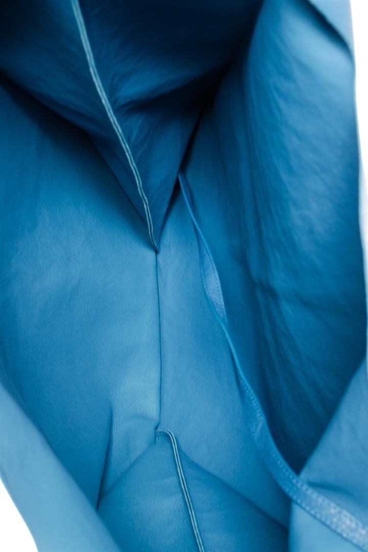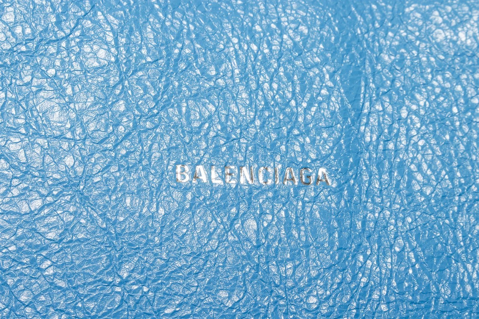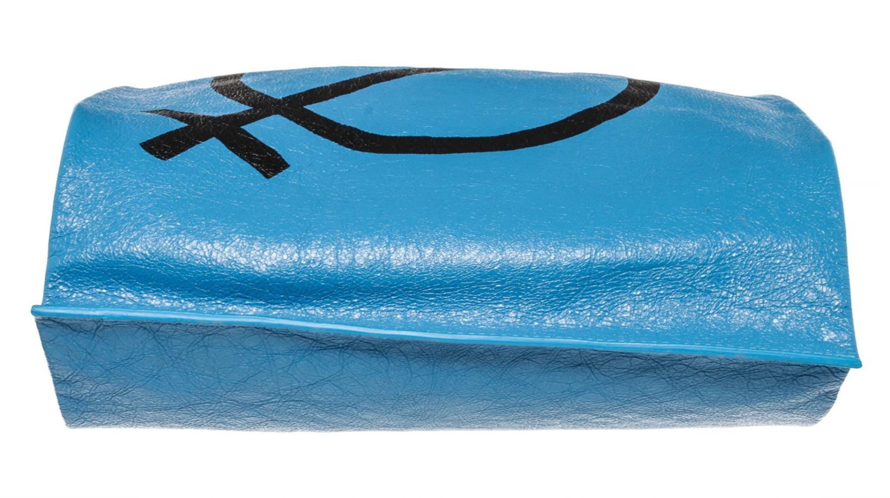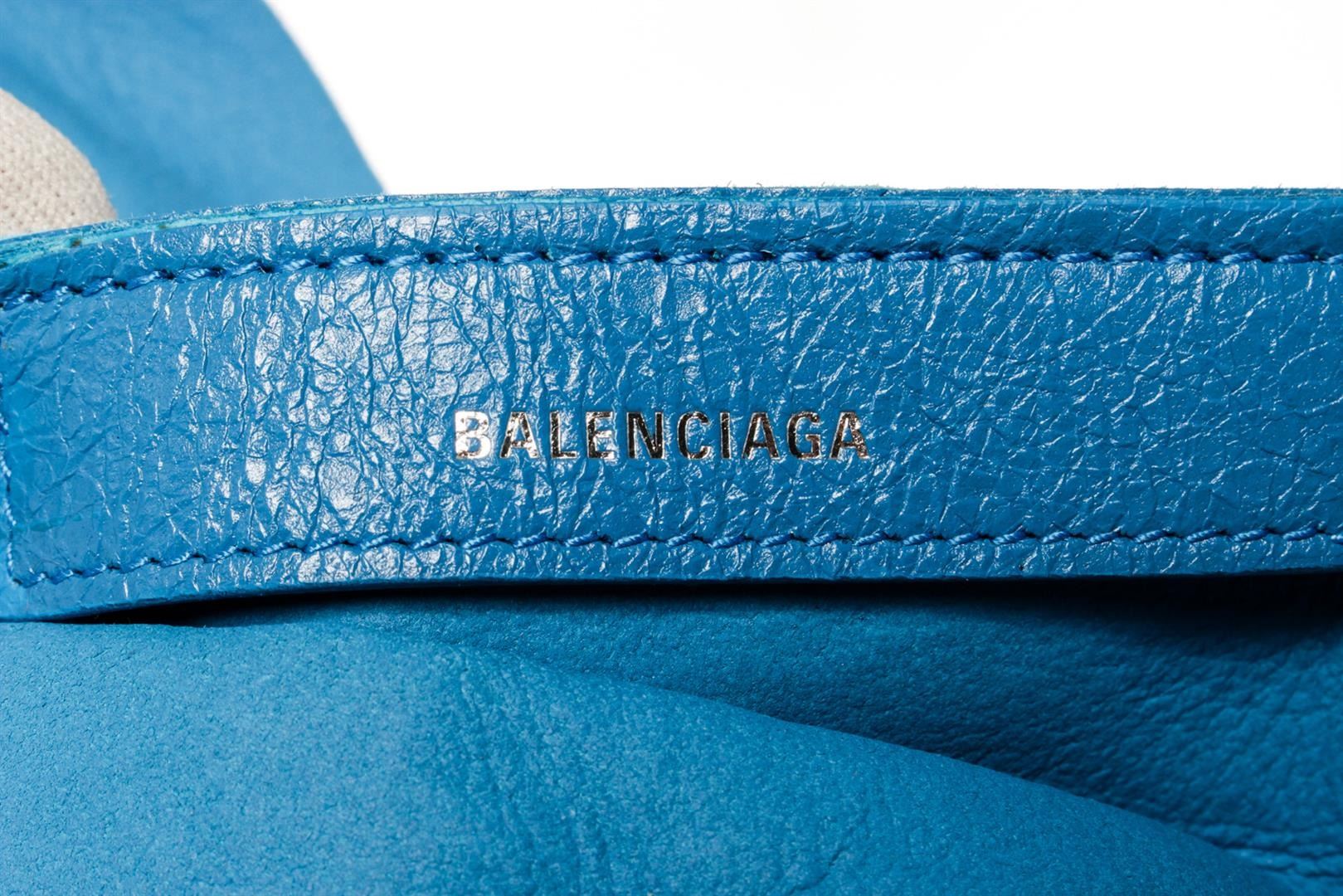 Blue printed leather Balenciaga Supermarket Shopper tote bag with dual flat handle, black front logo, removable inner clutch with zip closure and blue leather lining. Handle Drop 6", Height 15", Width 13", Depth 0.5"