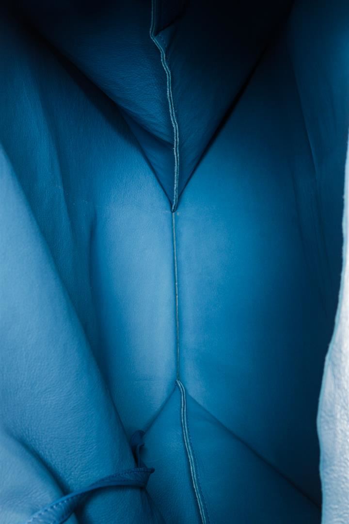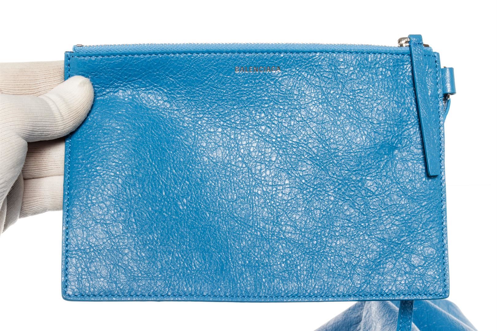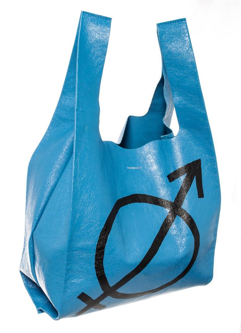 One Balenciaga Blue Printed Leather Supermarket Shopper Tote Bag. Item is sold AS-IS. Please check photos and descriptions for all available details. Blue printed leather Balenciaga Supermarket Shopper tote bag with dual flat handle, black front logo, removable inner clutch with zip closure and blue leather lining. Handle Drop 6", Height 15", Width 13", Depth 0.5"