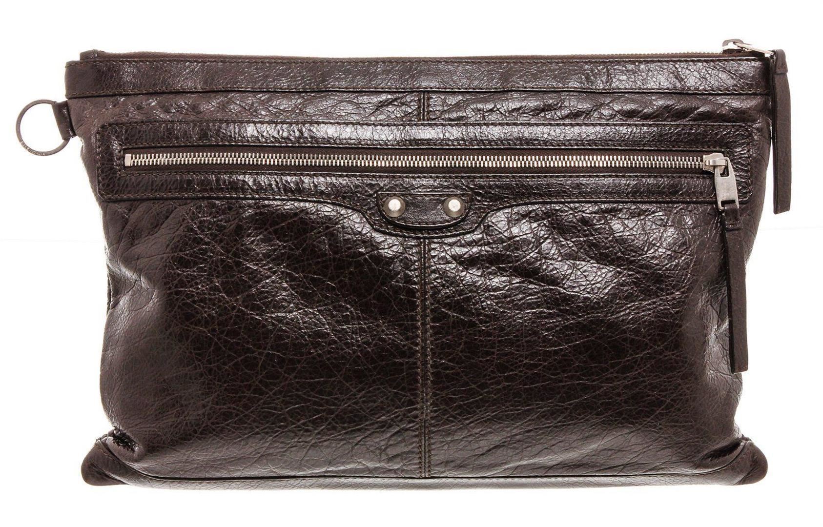 Brown Agneau leather Balenciaga Classic Clip L clutch with silver-tone hardware, single zip pocket at front face, black canvas lining and zip closure at top. Measurements: Length: 12.75 in / 32 cm Width: 0.5 in / 1 cm 9 in / 23 cmCONDITION: Pre-Owned Good overall, please see photographs for detail.