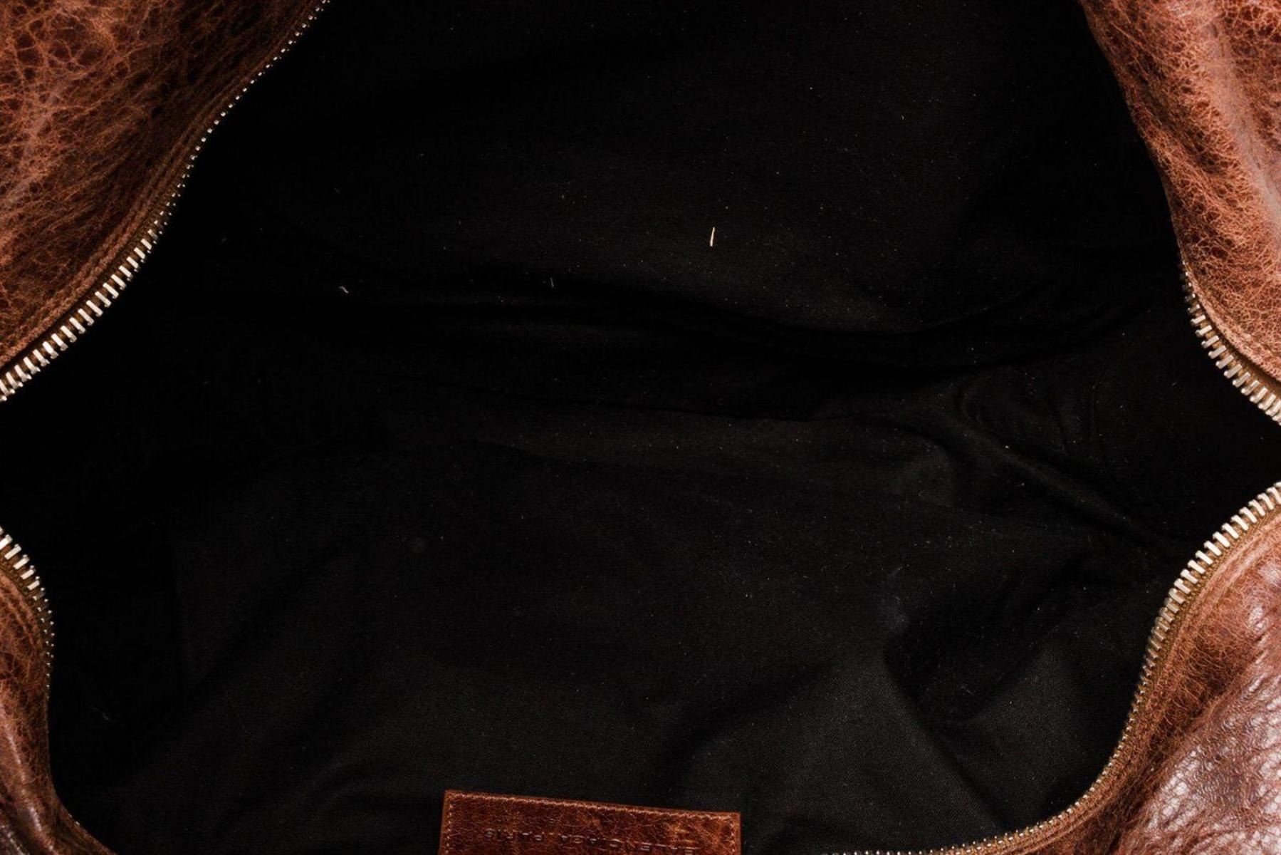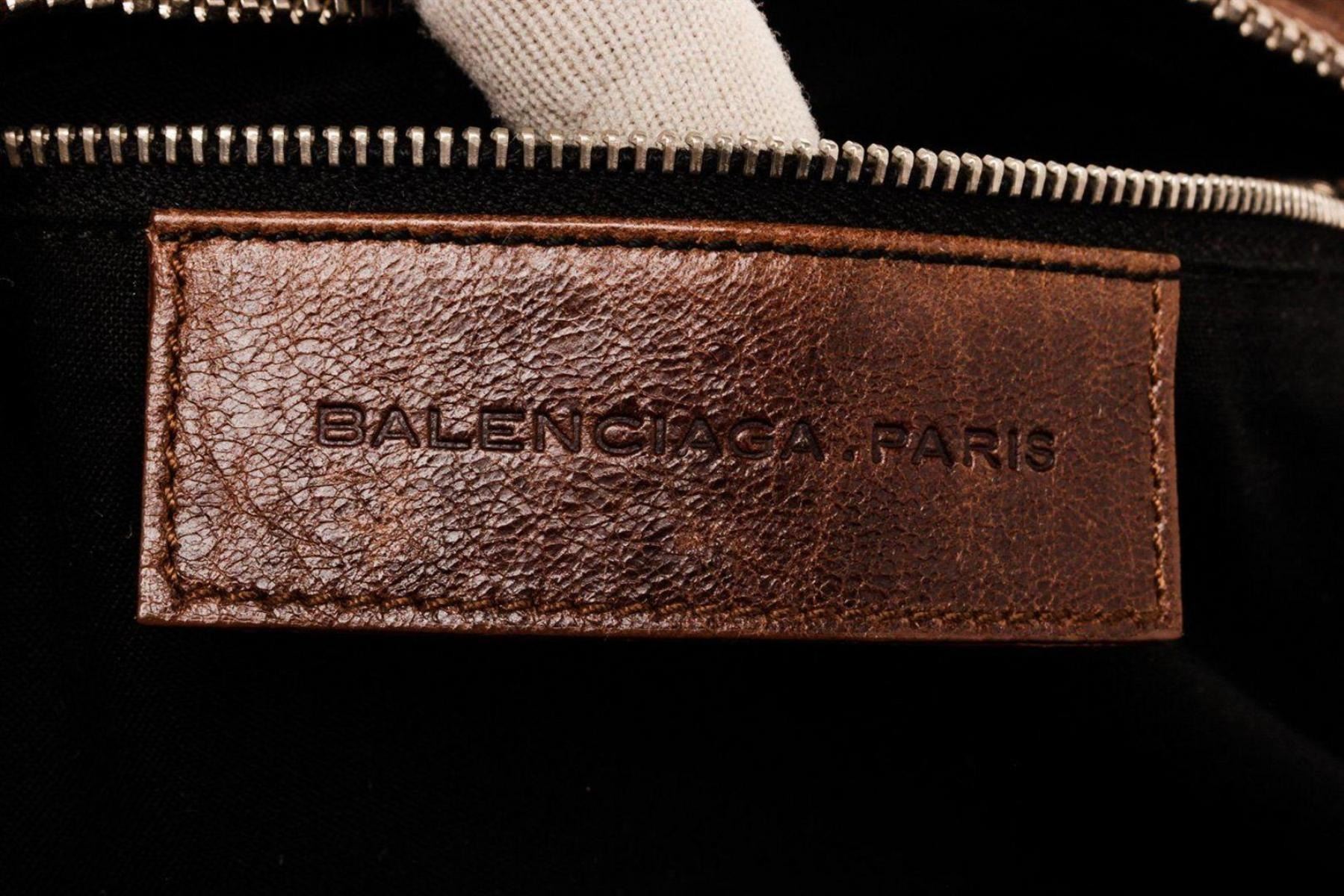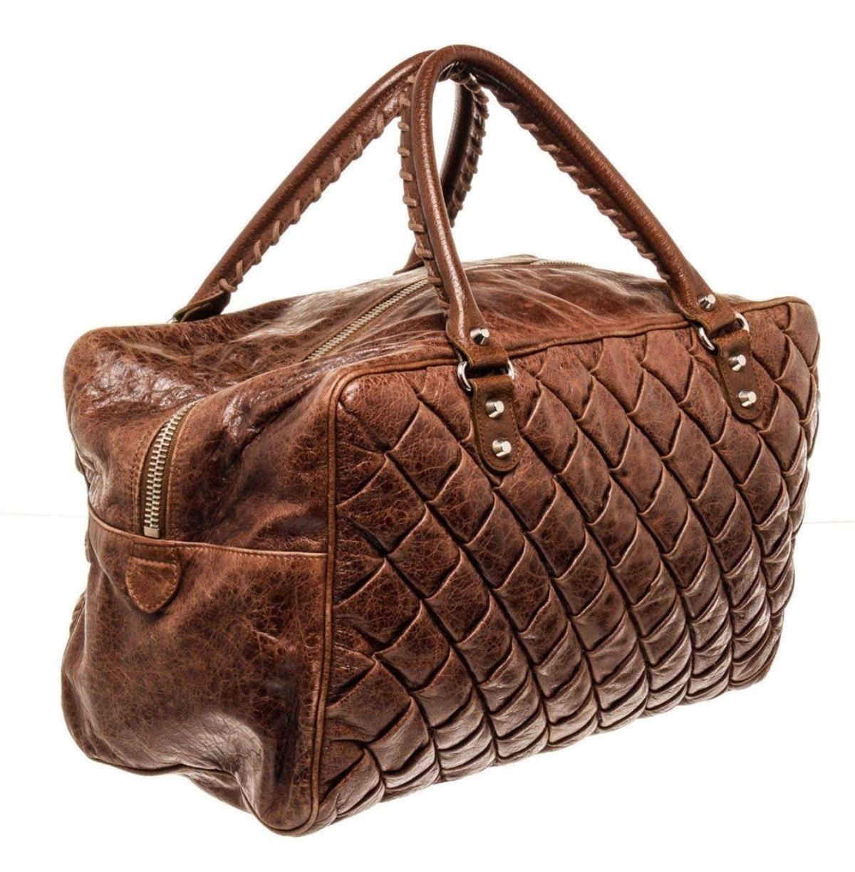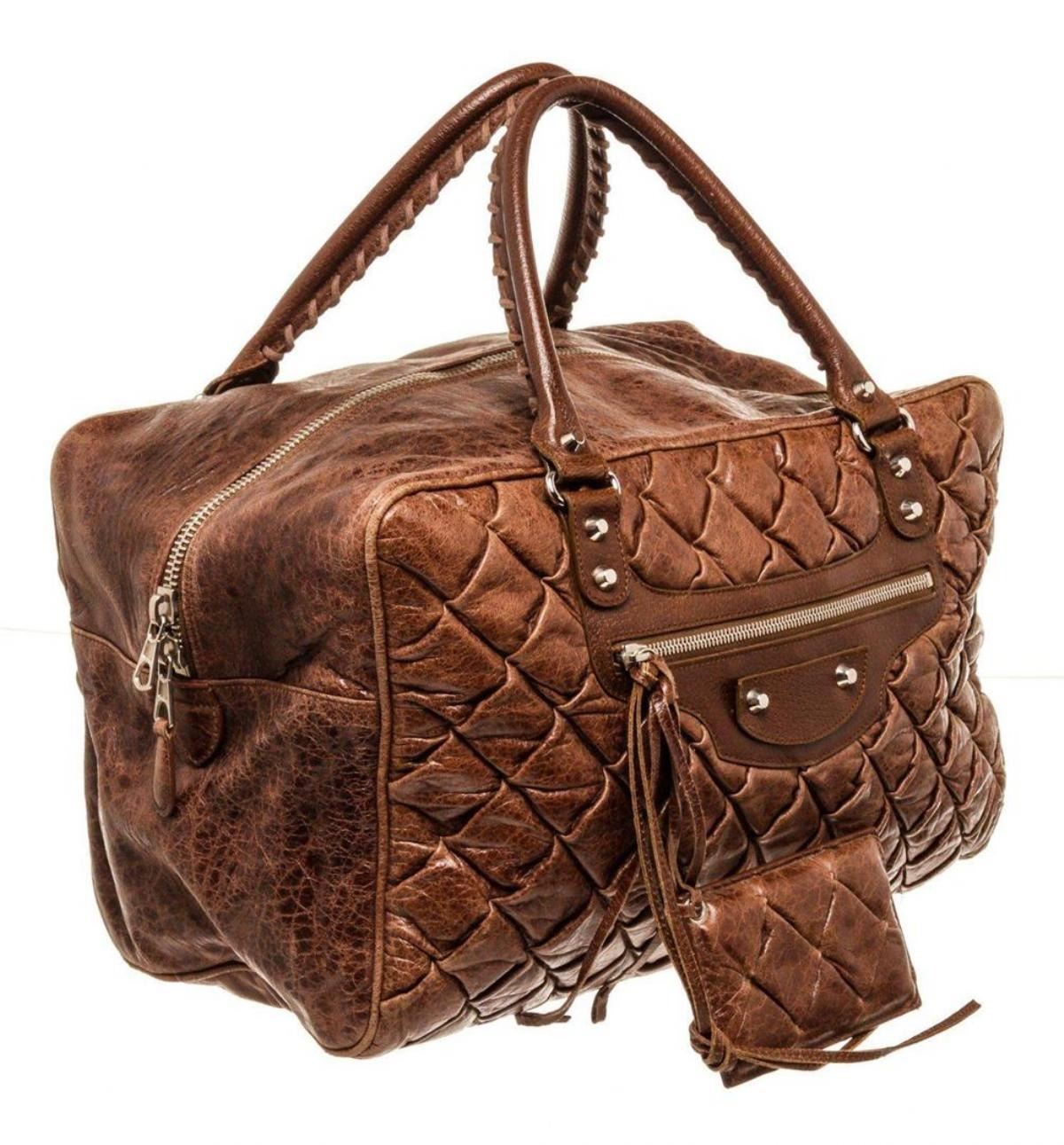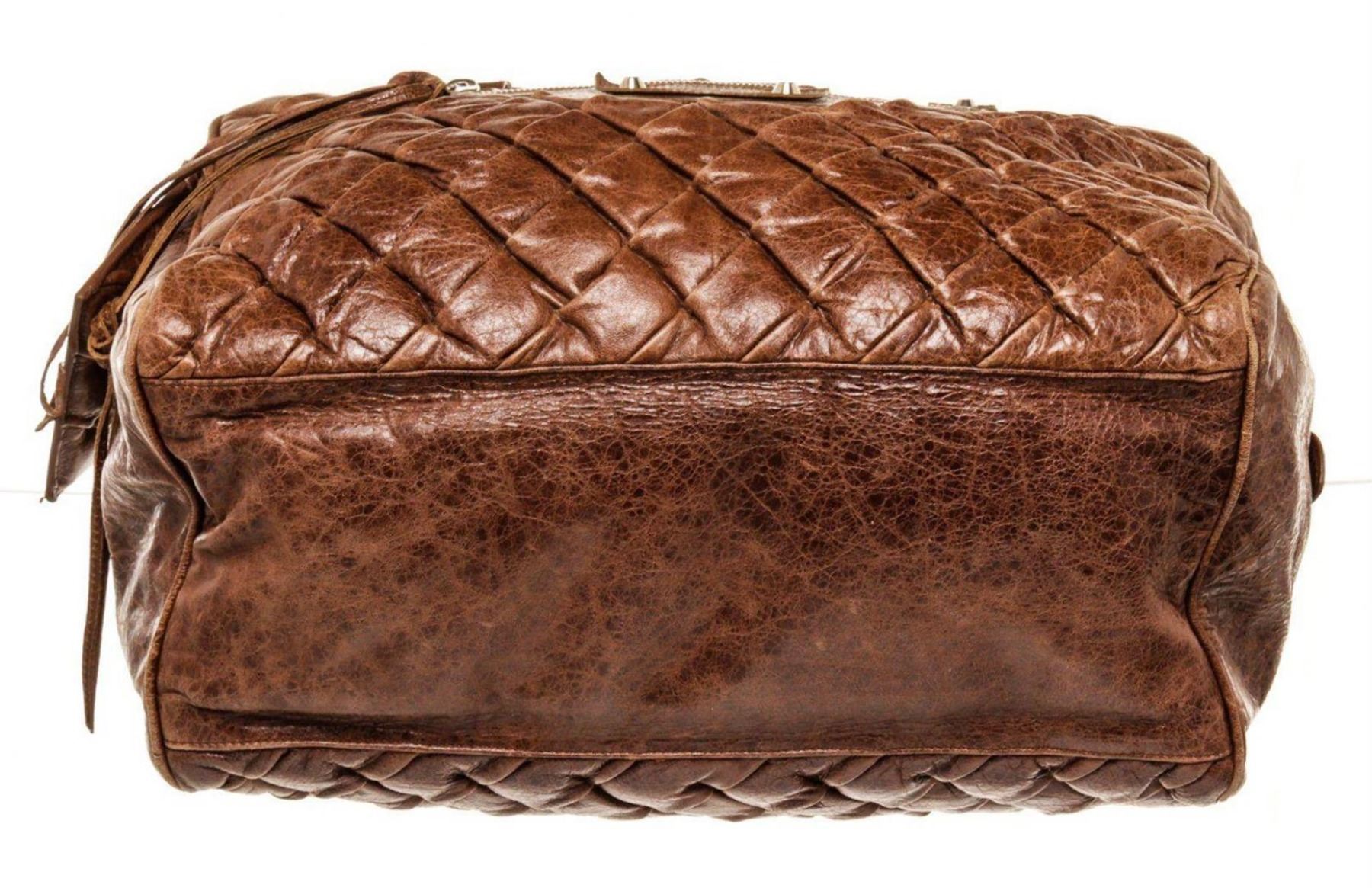 Balenciaga Brown Quilted Leather Motorcycle Shoulder Bag with material quilted leather gold-tone hardware, dual rolled top handles with leather trim, single zip pocket with stud and buckle embellishments at front, canvas lining, interior pockets; one with zip closure and zip closure at top.