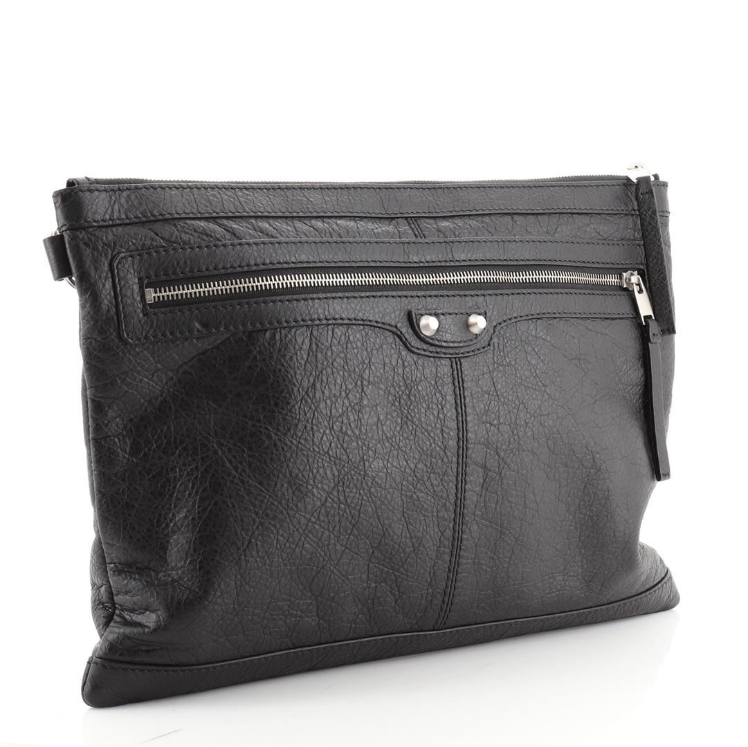 One Balenciaga Classic City Clip Pouch Leather Large Black. Item is sold AS-IS. All available information is listed in the description and shown in the photo. Balenciaga Classic City Clip Pouch Leather Large Black Condition Details: Light wear on base corners and in interior, scratches on hardware. Height 10", Width 14.5", Depth 0.5", Strap Drop None
