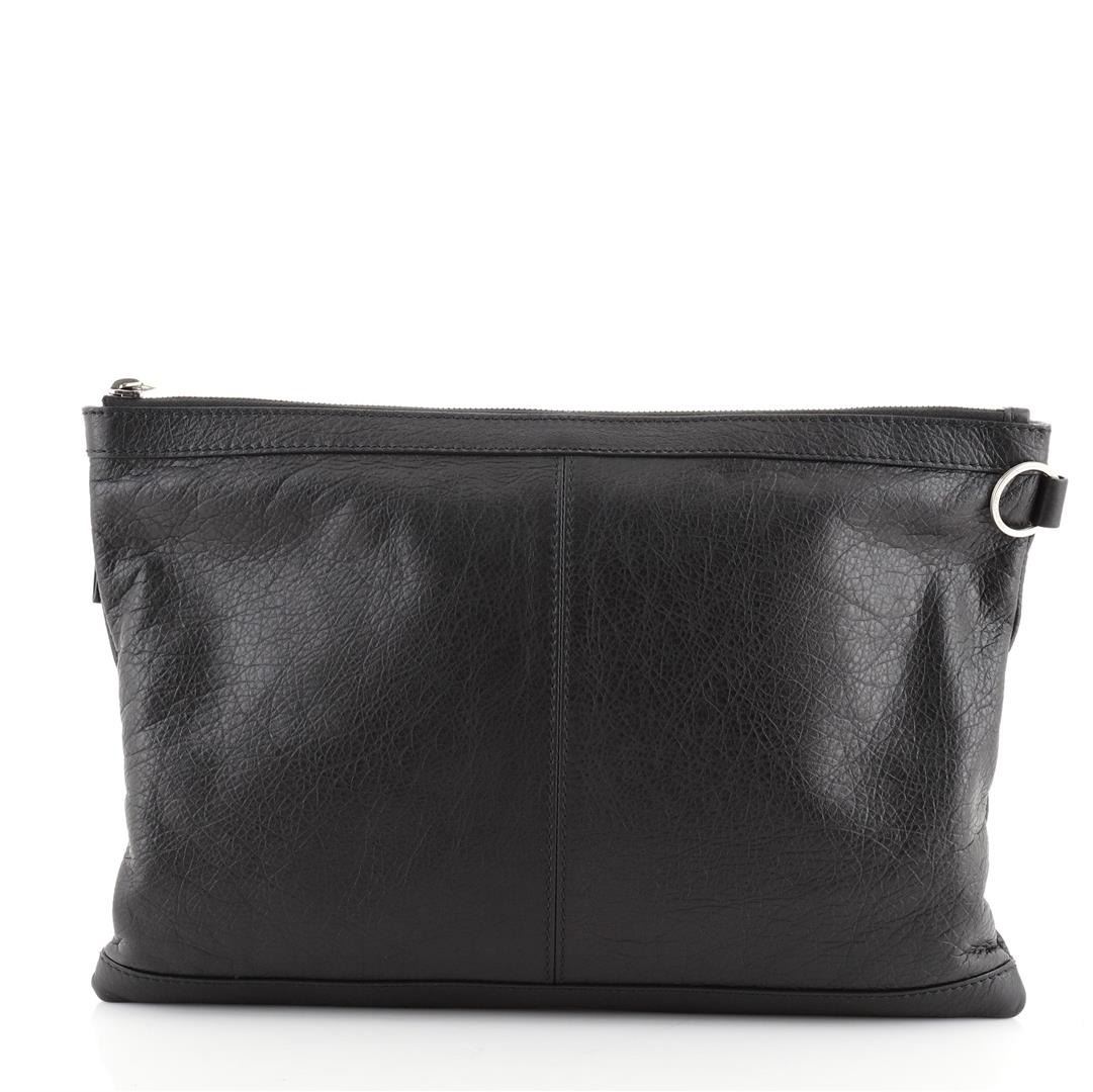 One Balenciaga Classic City Clip Pouch Leather Large Black. Item is sold AS-IS. All available information is listed in the description and shown in the photo. Balenciaga Classic City Clip Pouch Leather Large Black Condition Details: Light wear on base corners and in interior, scratches on hardware. Height 10", Width 14.5", Depth 0.5", Strap Drop None
