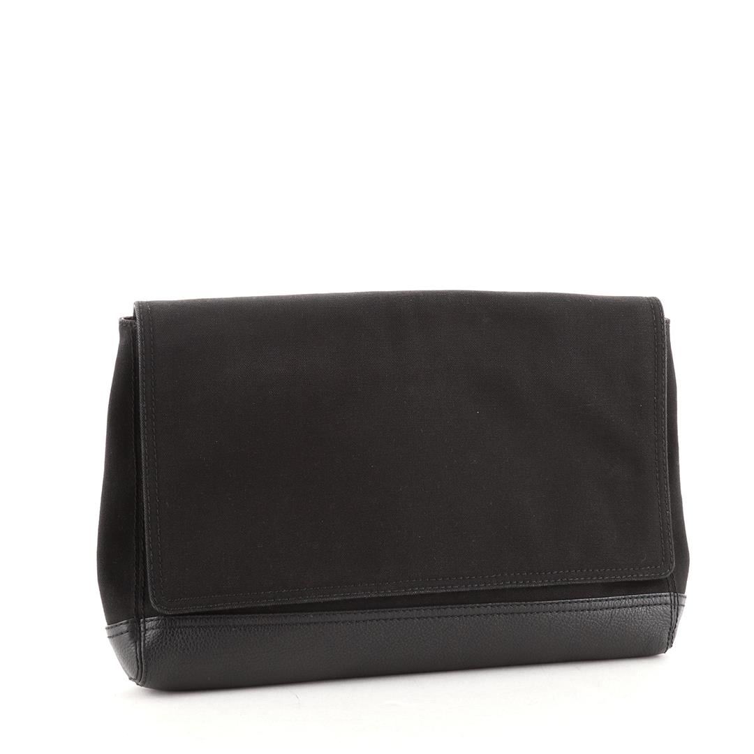 One Balenciaga Flap Clutch Canvas with Leather Black. Item is sold AS-IS. All available information is listed in the description and shown in the photo. Balenciaga Flap Clutch Canvas with Leather Black Canvas Leather Condition Details: Minor discoloration and wear on exterior and in interior, slight creasing underneath flap, scratches on hardware. Height 9", Width 13", Depth 4.4", Strap Drop None