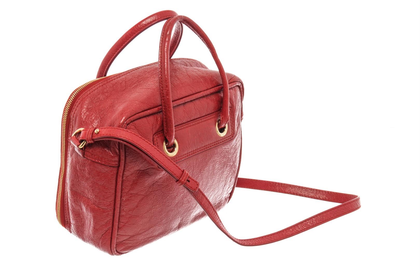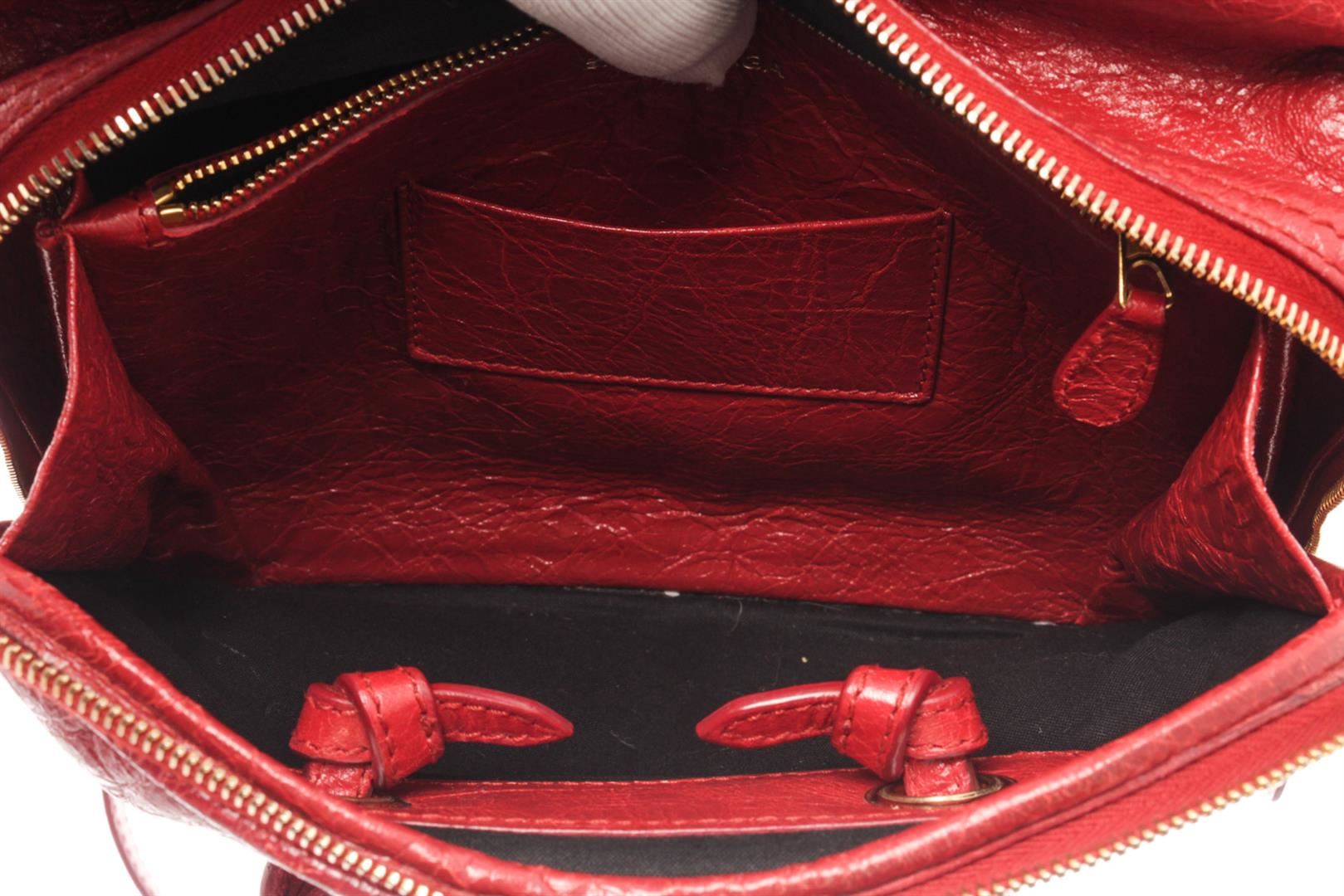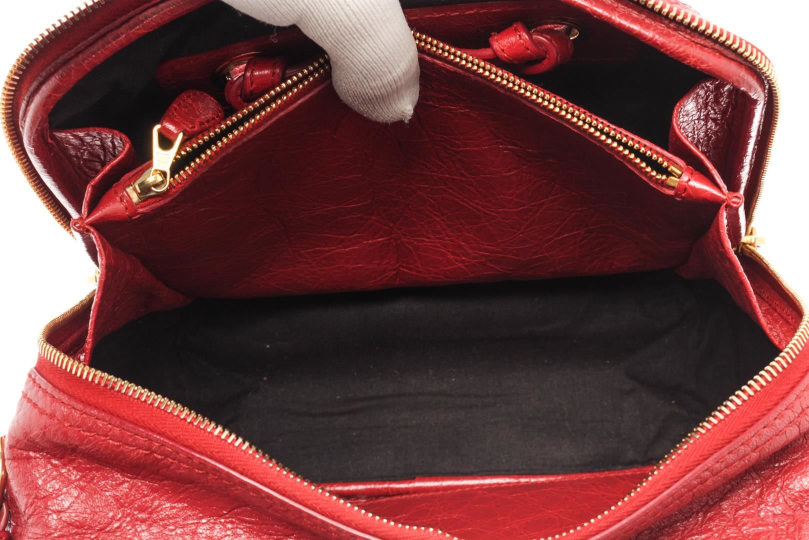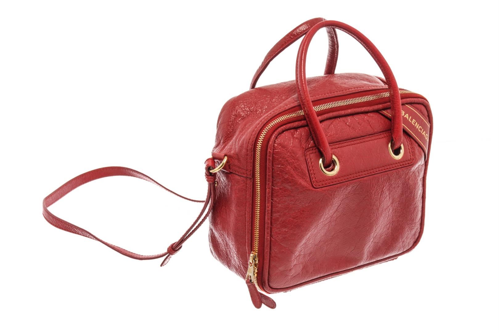 Balenciaga Red Leather Small Blanket Square Bag. All available information is listed in the description and shown in the photos. Balenciaga Red Leather Small Blanket Square Bag with rolled leather handles and an optional adjustable shoulder strap, This opens to a partitioned black fabric interior with patch pockets and a central zipper compartment. Height: 8 in (20.32 cm), Width: 9.5 in (24.13 cm), Depth: 4 in (10.16 cm)