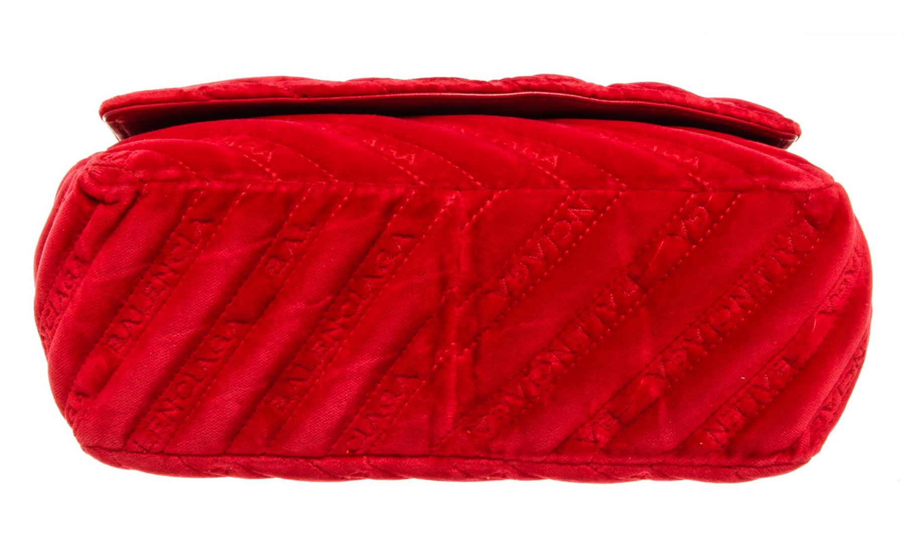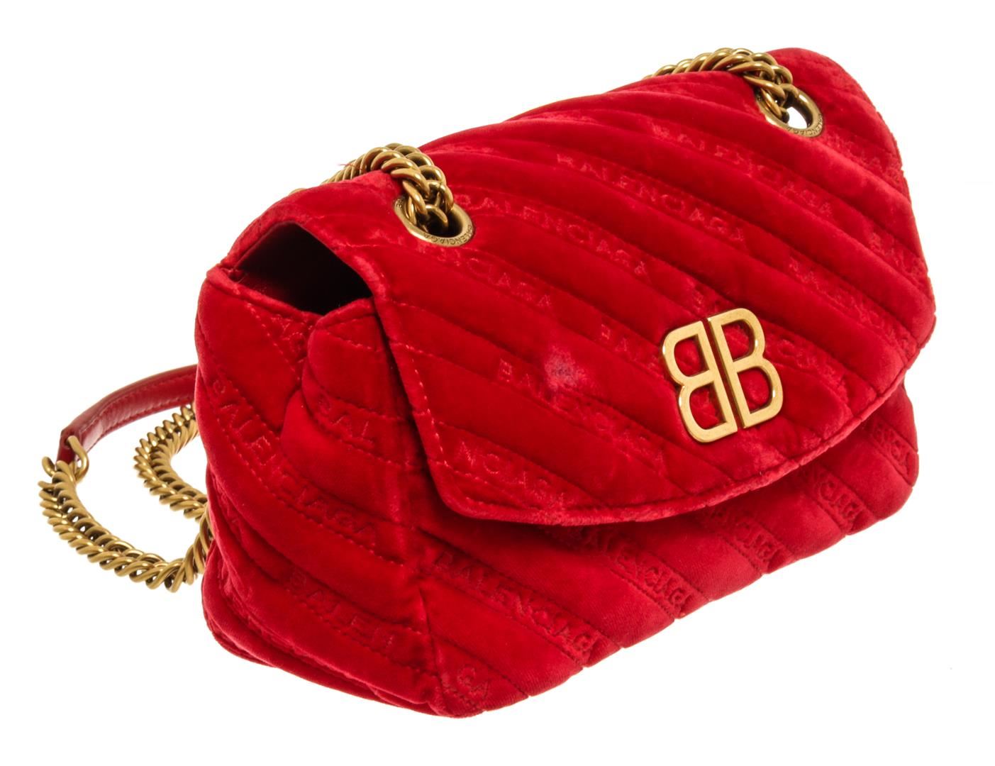 One Balenciaga Red Velvet BB Chain Shoulder Bag. Item is sold AS-IS. All available information is listed in the description and shown in the photo. Balenciaga Red Velvet BB Chain Shoulder Bag with a chain shoulder strap, gold hardware, leather lining, six card holders, one zipper pocket, snap closure.