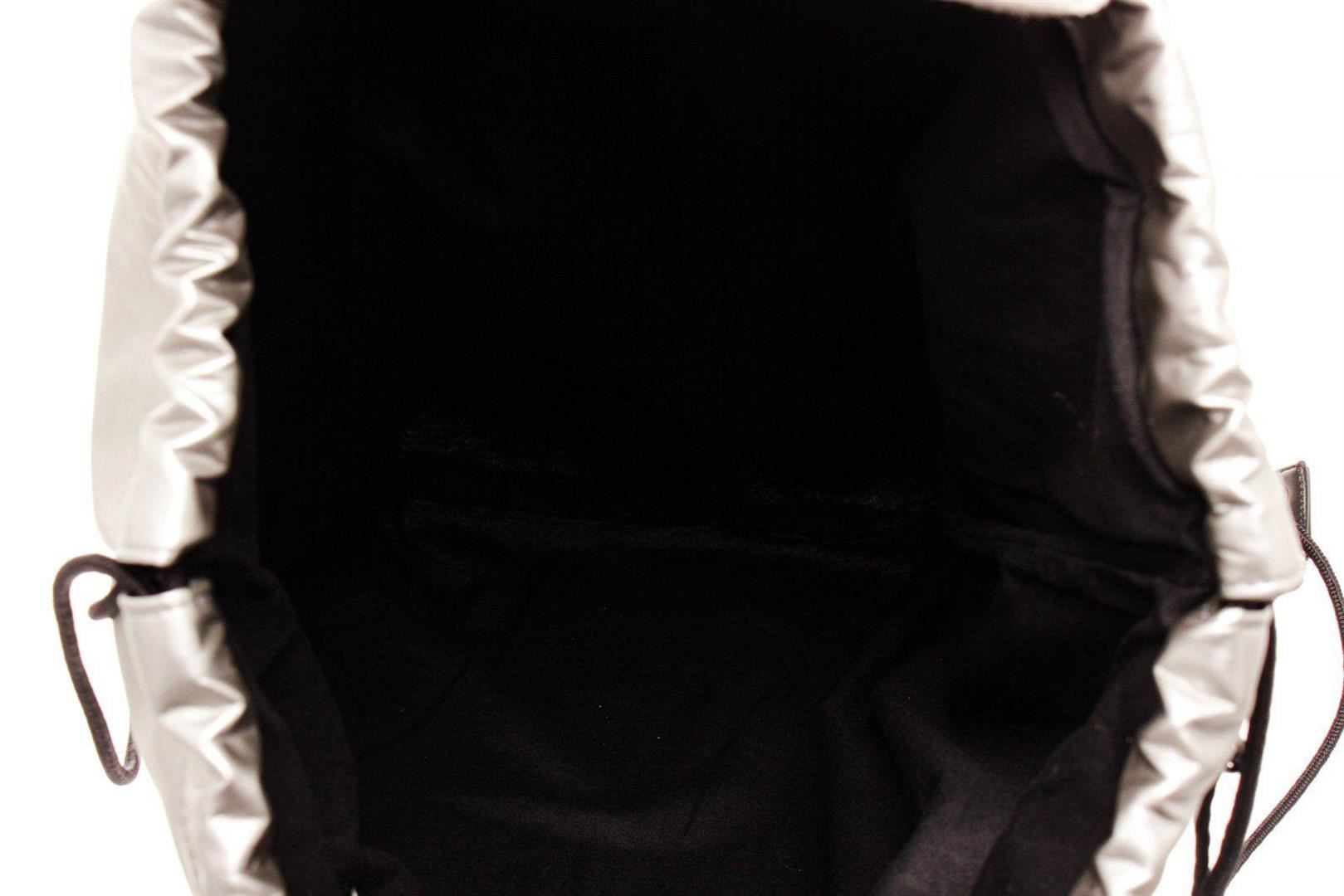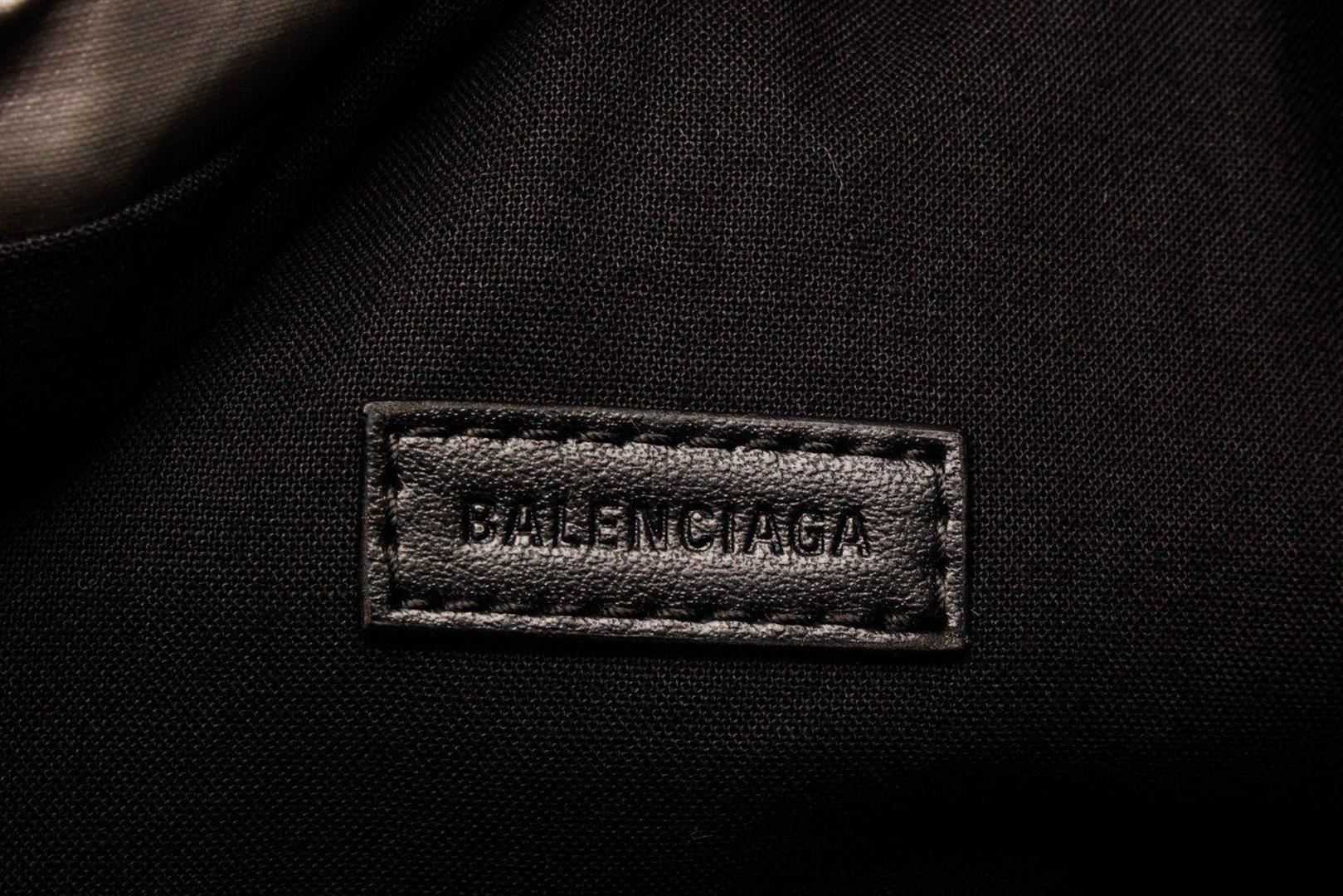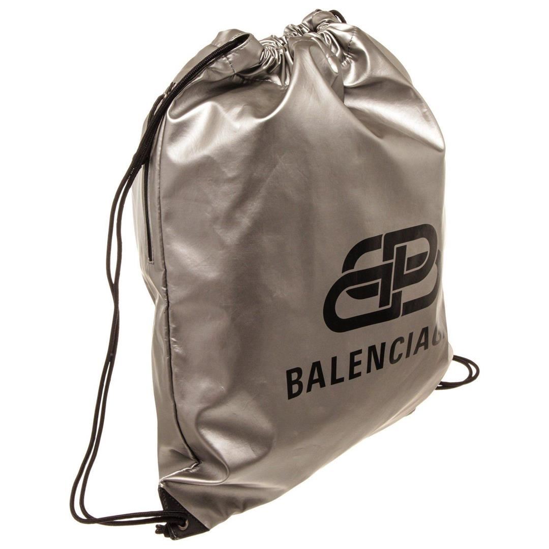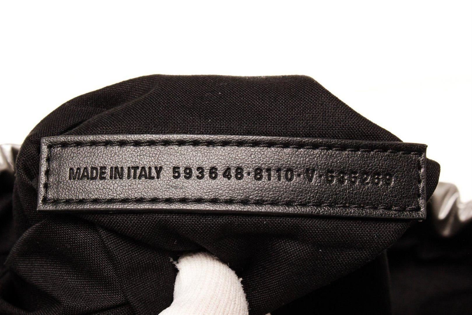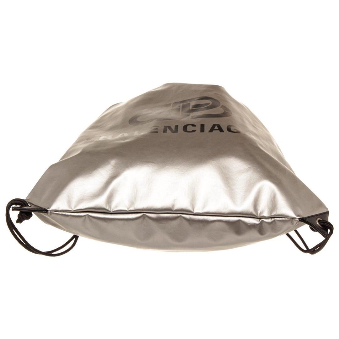 Balenciaga Silver Leather BB Explorer Shoulder Bag with silver-tone hardware, dual flat top handle, dual flat shoulder straps, leather trim, single exterior zip pocket, tonal woven lining, four pockets at interior walls; one with zip closure and drawstring closure at top.