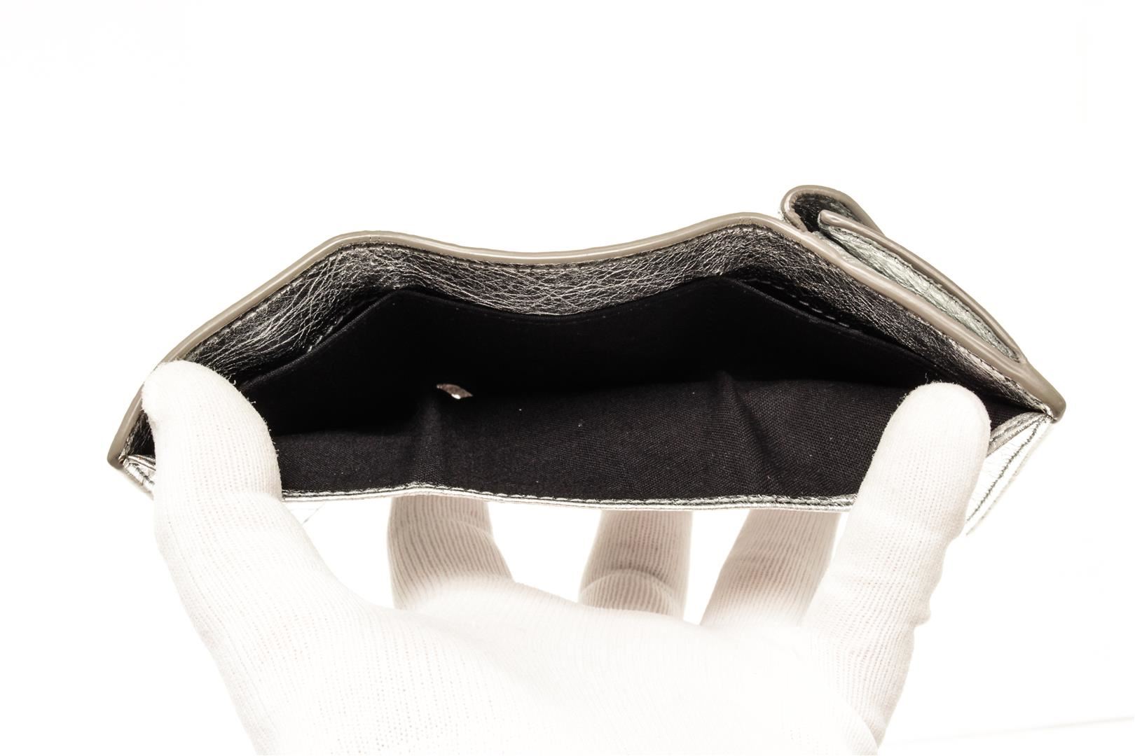 One Balenciaga Silver Papier Flap Mini Wallet. Item is sold AS-IS. All available information is listed in the description and shown in the photo. Balenciaga Silver-toned Papier flap mini wallet features an envelope style with a leather exterior with an embossed logo, a fold-over top with snap closure, and two compartments: one for coins or miscellaneous and one for cash.