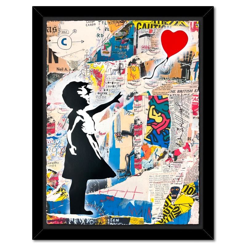 "Balloon Girl" is a unique (UNIQ) mixed media on deckle edge paper by Mr. Brainwash, hand signed and bearing the thumbprint of the artist inverso. This piece comes custom framed. Includes Certificate of Authenticity. Measures approx. 34" x 26" (frame), 30" x 22" (image).