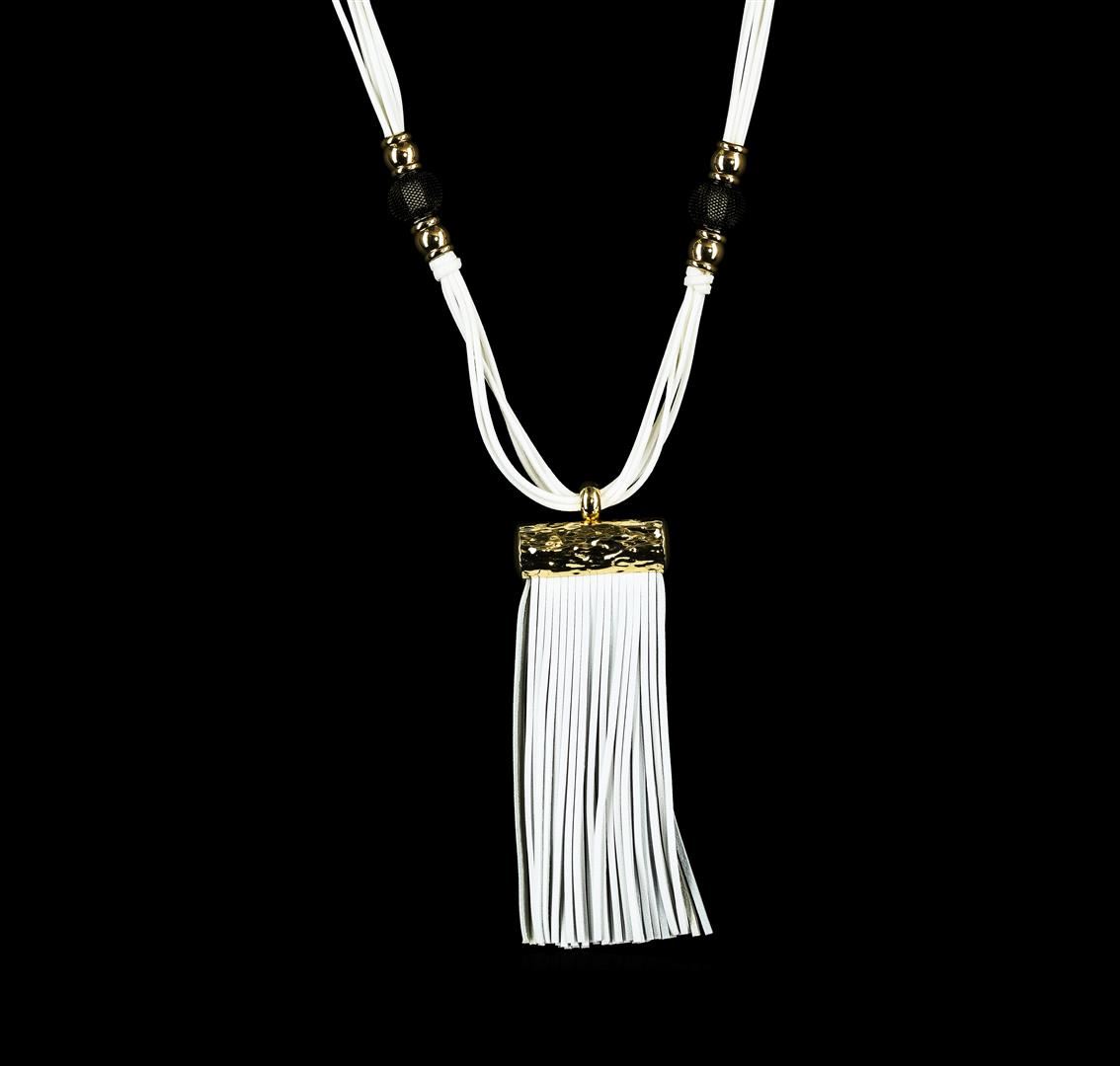 High end designer jewelry. Bamboo Leather Tassel Necklace - Gold Plated. Gold Plated Metal/4" Ext Clasp. White/gold. 31/4inches. Total Weight: 57.6 grams.