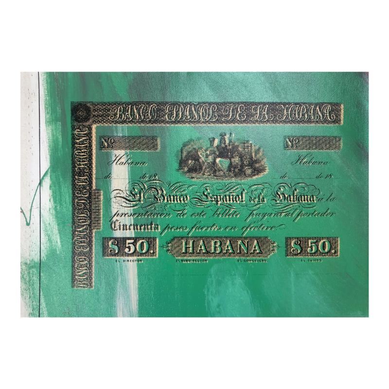 "Banco Espanol de la Habana" is limited edition hand pulled silkscreen unique mixed media on canvas by Andy Warhol protege Steve Kaufman (1960-2010). This piece is numbered and hand signed inverso and includes a letter of authenticity. As is common with Kaufman's works, this piece may have perceived minor flaws, but is in overall good condition. Measures approximately 12.5" x 18" before cropping.