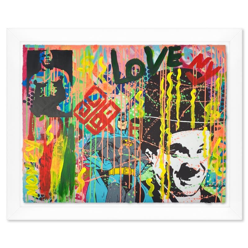 "Batman And Chaplin" is a one-of-a-kind mixed media on deckle edge paper by Nastya Rovenskaya, Hand signed by the artist. This piece comes floating in a custom frame. Includes Letter of Authenticity. Measures approximately 28" x 34" (framed), 24" x 30" (image).