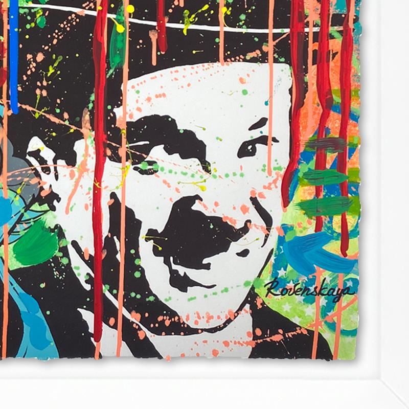"Batman And Chaplin" is a one-of-a-kind mixed media on deckle edge paper by Nastya Rovenskaya, Hand signed by the artist. This piece comes floating in a custom frame. Includes Letter of Authenticity. Measures approximately 28" x 34" (framed), 24" x 30" (image). This item requires special handling and may have a longer than usual turnaround.