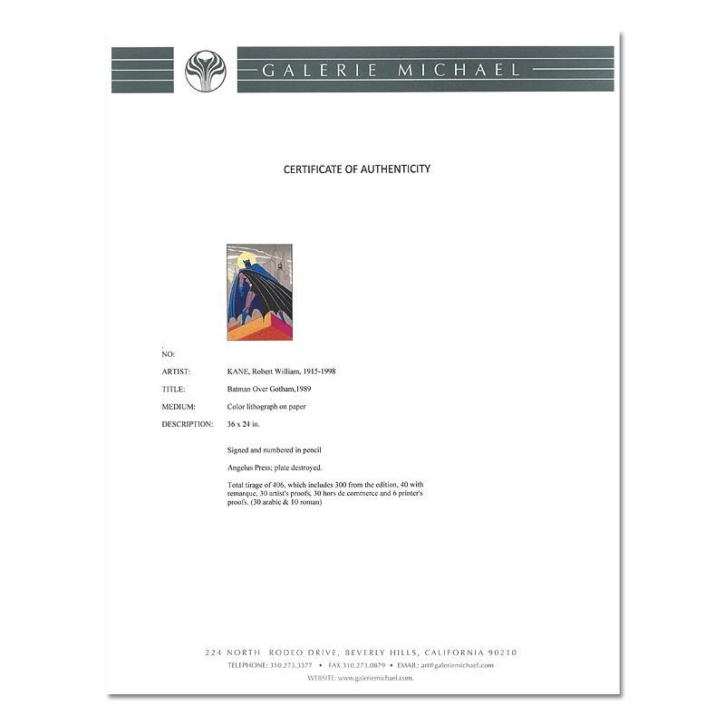 "Batman Over Gotham" is a 1989 limited edition original lithograph on paper by Bob Kane (1915-1998), creator of the DC comics character. This piece is numbered and hand signed by Bob Kane and comes framed. Includes Certificate of Authenticity. This item requires special handling and may have a longer than usual turnaround. Measures approximtately 42" x 30" (framed), 36" x 24" (image).