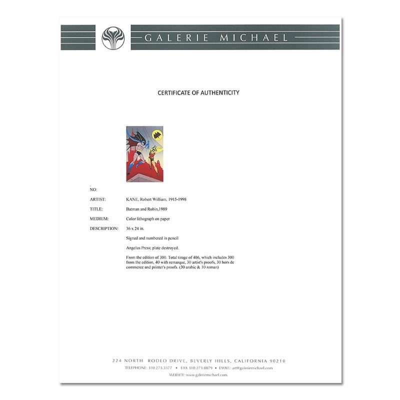 "Batman & Robin" is a 1989 limited edition original lithograph on paper by Bob Kane (1915-1998), creator of the DC comics character. This piece is numbered and hand signed by Bob Kane and comes framed. Includes Certificate of Authenticity. This item requires special handling and may have a longer than usual turnaround. Measures approximtately 42" x 30" (framed), 36" x 24" (image).