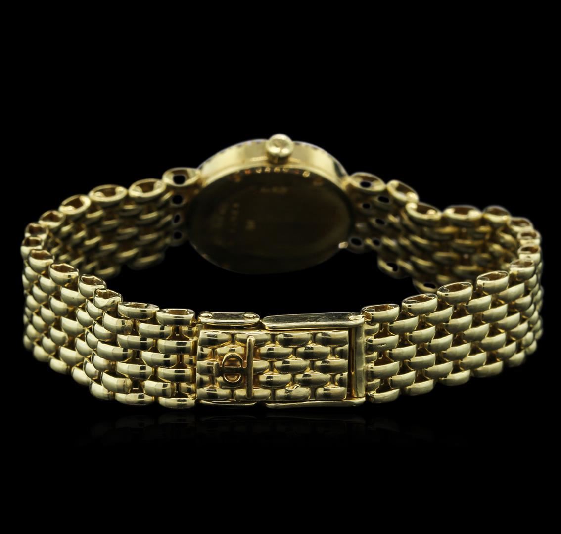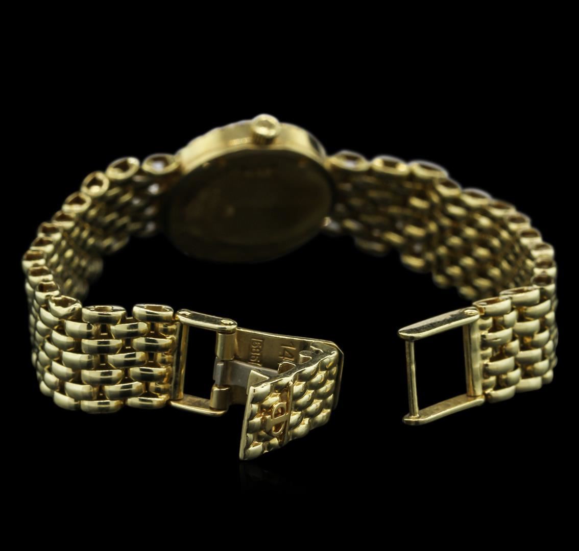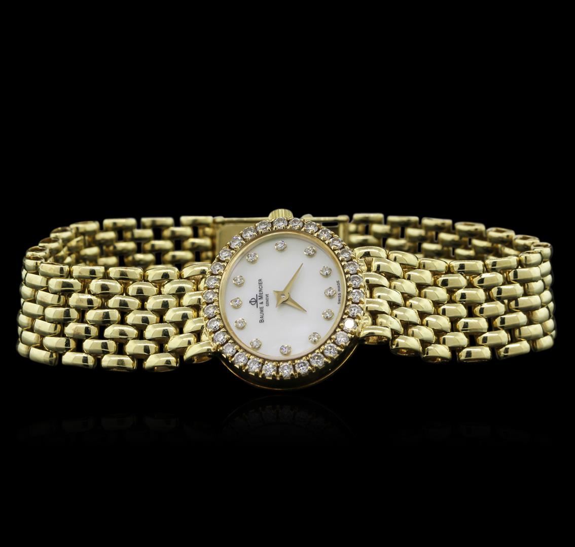 Ladies 14KT yellow gold Baume & Mercier watch with diamond bezel, mother of pearl dial, sapphire crystal, diamond index hour markers, gold tone hands, and 14KT yellow gold bracelet.