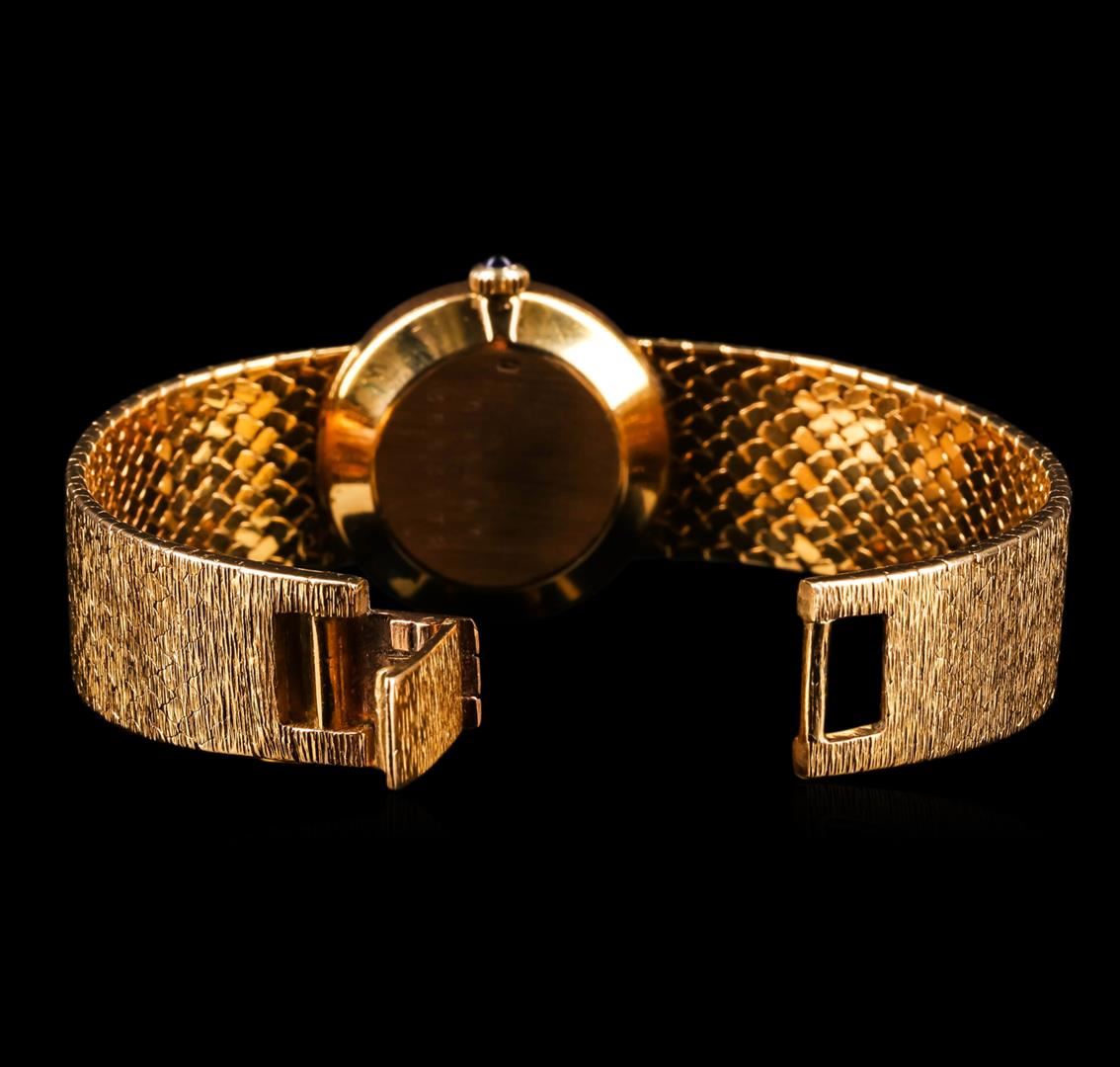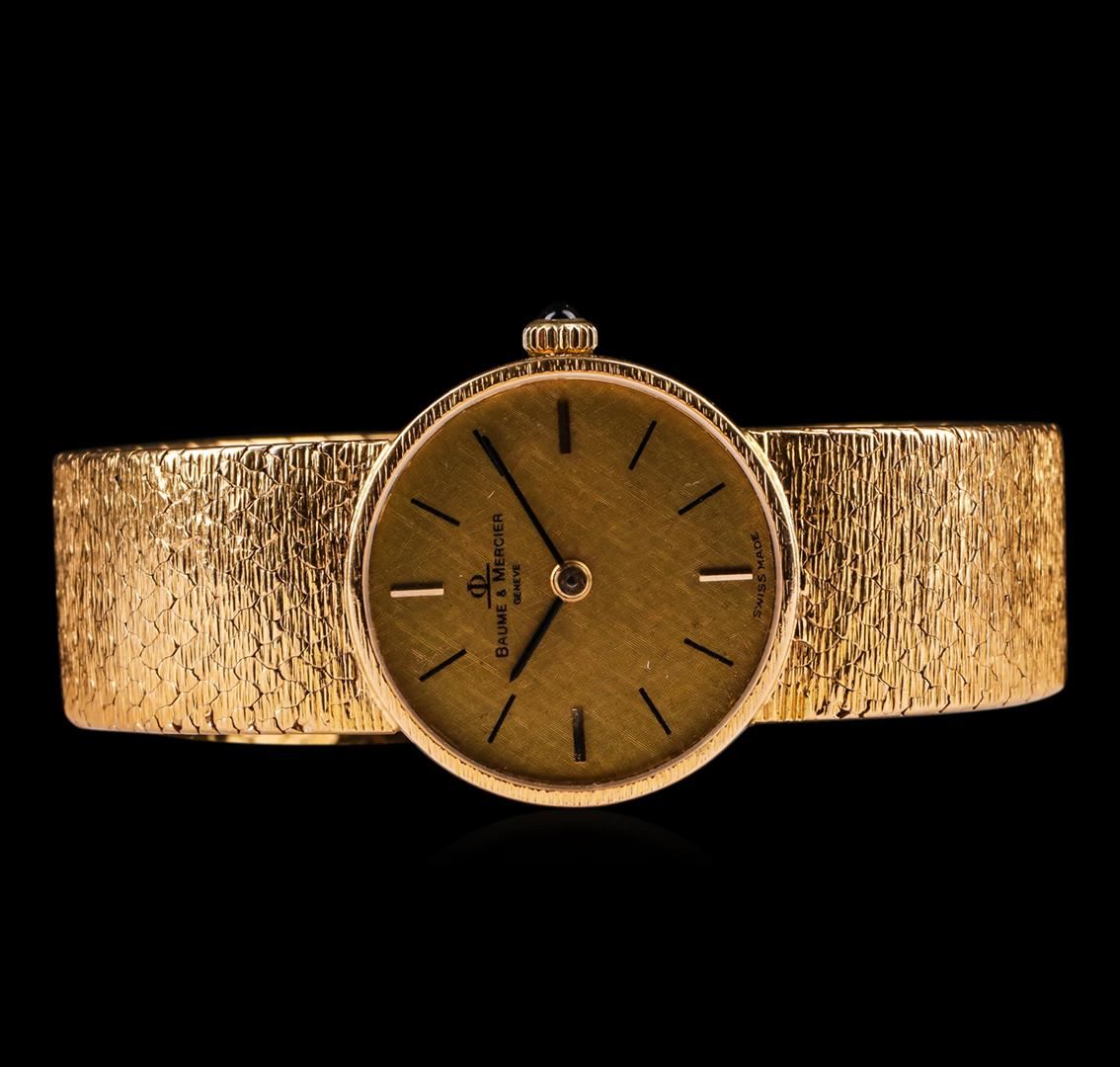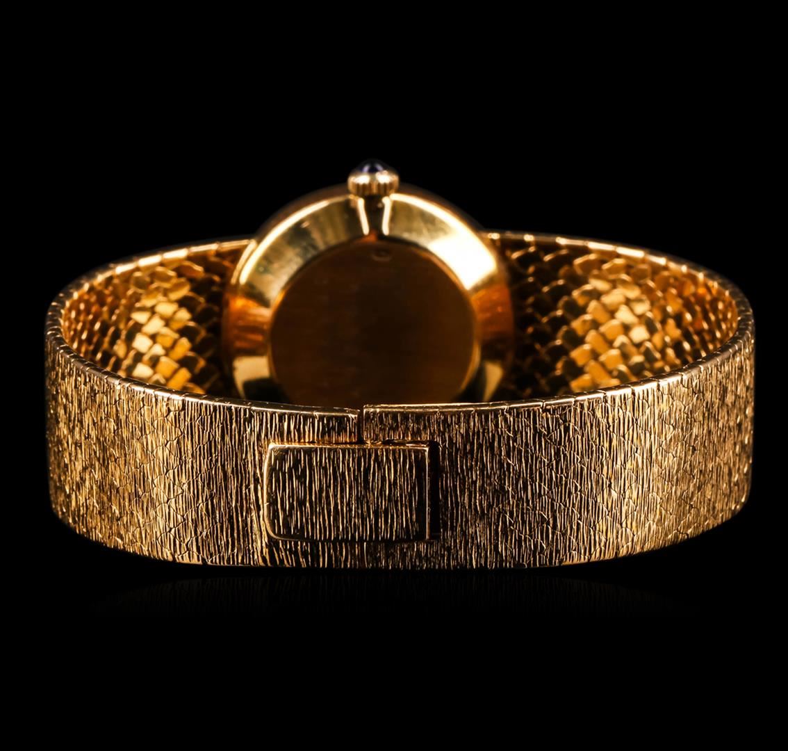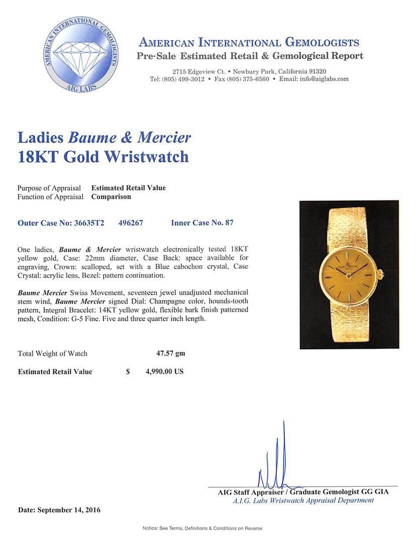 One ladies, Baume & Mercier wristwatch electronically tested 18KT yellow gold, Case: 22mm diameter, Case Back: space available for engraving, Crown: scalloped, set with a Blue cabochon crystal, Case Crystal: acrylic lens, Bezel: pattern continuation. Baume Mercier Swiss Movement, seventeen jewel unadjusted mechanical stem wind, Baume Mercier signed Dial: Champagne color, hounds-tooth pattern, Integral Bracelet: 14KT yellow gold, flexible bark finish patterned mesh, Condition: G-5 Fine. Five and three quarter inch length. Total Weight of Watch 47.57gm. AIG Appraised at $4,990.00.