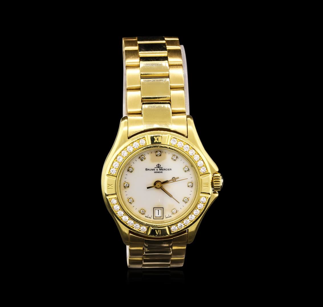 One ladies, Baume & Mercier wristwatch electronically tested 18KT yellow gold, Case: 28mm, Swiss Hallmarked Case Back: engraved with the manufacturers name & ID numbers, Fixed Bezel: diamond set, Crystal: synthetic sapphire. Movement: Swiss quartz, Dial: mother of pearl, with pointed hands, and diamond markers, Date Window: 6 o'clock position, Bracelet: integral Baume & Mercier link, Bright polish finish, Condition: G-5 Fine. Six and three quarter inch length, concealed deployment clasp. Two additional links come with the watch. Containing: Twenty Eight round brilliant cut diamonds, measuring an average of 1.50mm in diameter, approximate total weight equals 0.30ct. Set & graded in the bezel. Clarity VVS-1 to VVS-2. Color: E - F. Total Weight of Diamonds 0.30ct. Total Weight of Watch 67.70gm. AIG Appraised at $7,150.00.