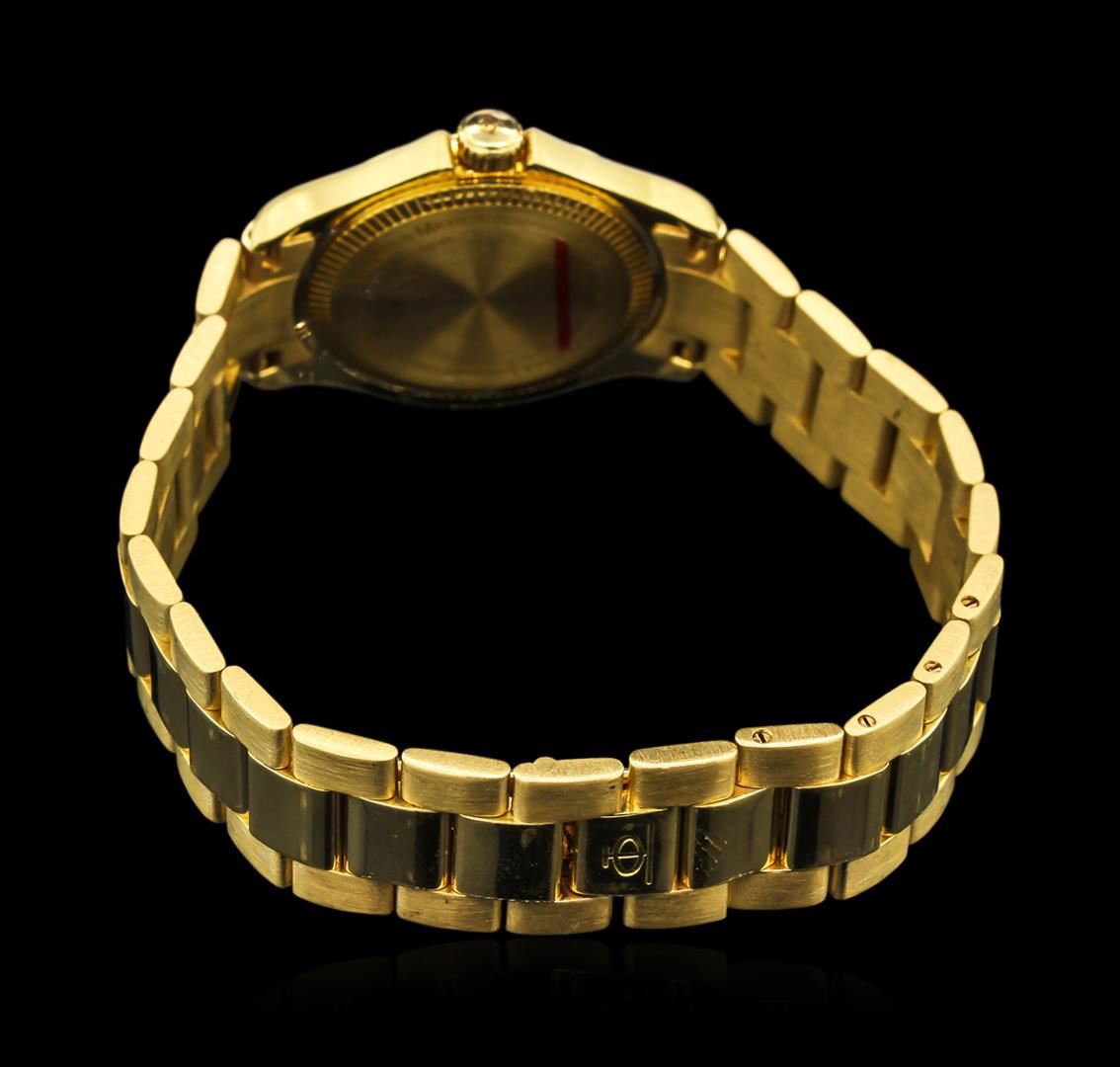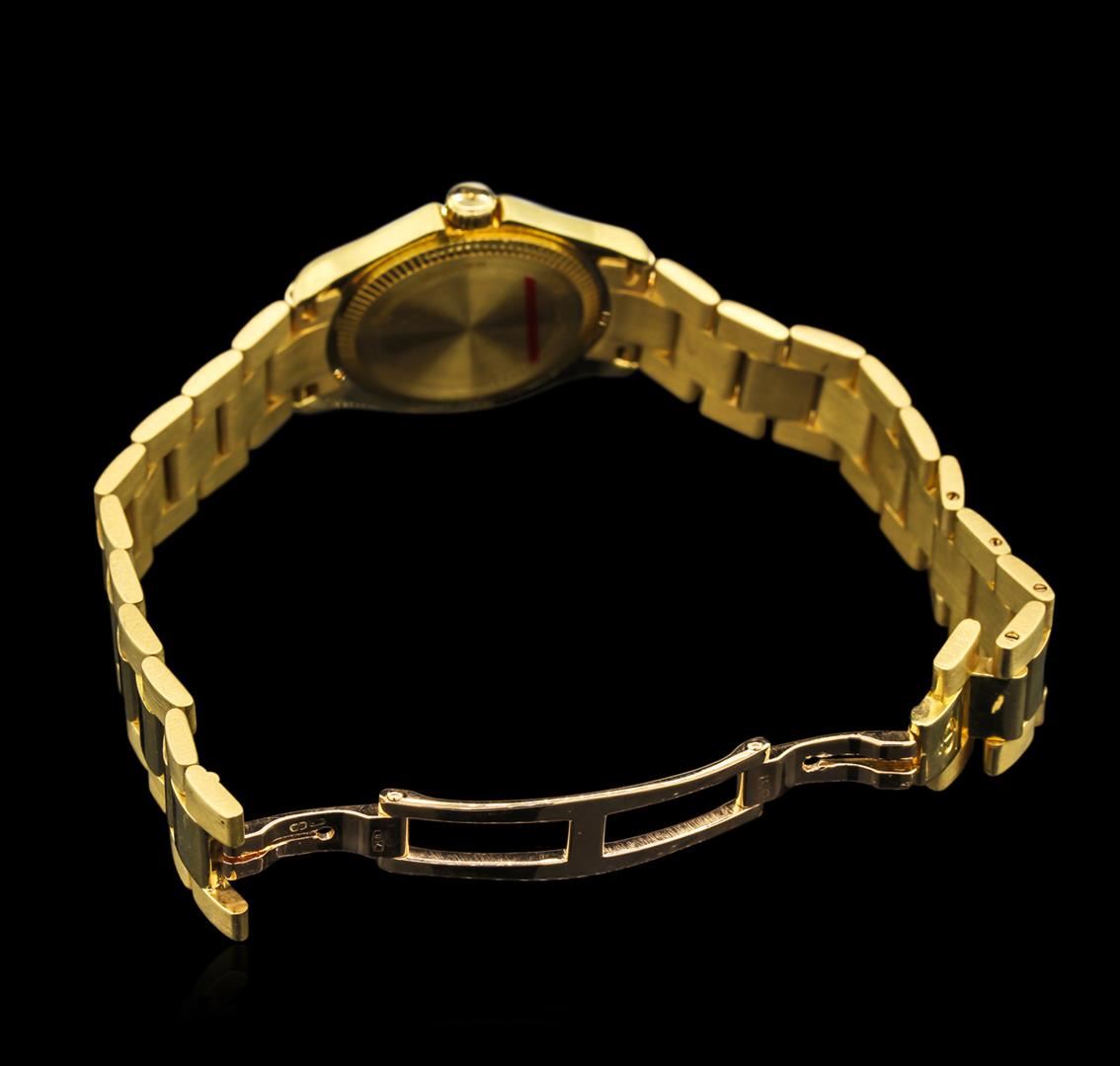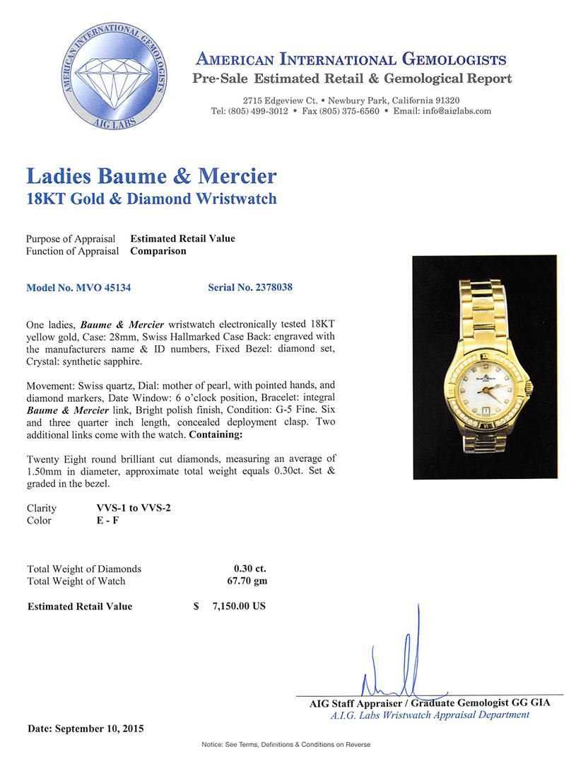 One ladies, Baume & Mercier wristwatch electronically tested 18KT yellow gold, Case: 28mm, Swiss Hallmarked Case Back: engraved with the manufacturers name & ID numbers, Fixed Bezel: diamond set, Crystal: synthetic sapphire. Movement: Swiss quartz, Dial: mother of pearl, with pointed hands, and diamond markers, Date Window: 6 o'clock position, Bracelet: integral Baume & Mercier link, Bright polish finish, Condition: G-5 Fine. Six and three quarter inch length, concealed deployment clasp. Two additional links come with the watch. Containing: Twenty Eight round brilliant cut diamonds, measuring an average of 1.50mm in diameter, approximate total weight equals 0.30ct. Set & graded in the bezel. Clarity VVS-1 to VVS-2. Color: E - F. Total Weight of Diamonds 0.30ct. Total Weight of Watch 67.70gm. AIG Appraised at $7,150.00.