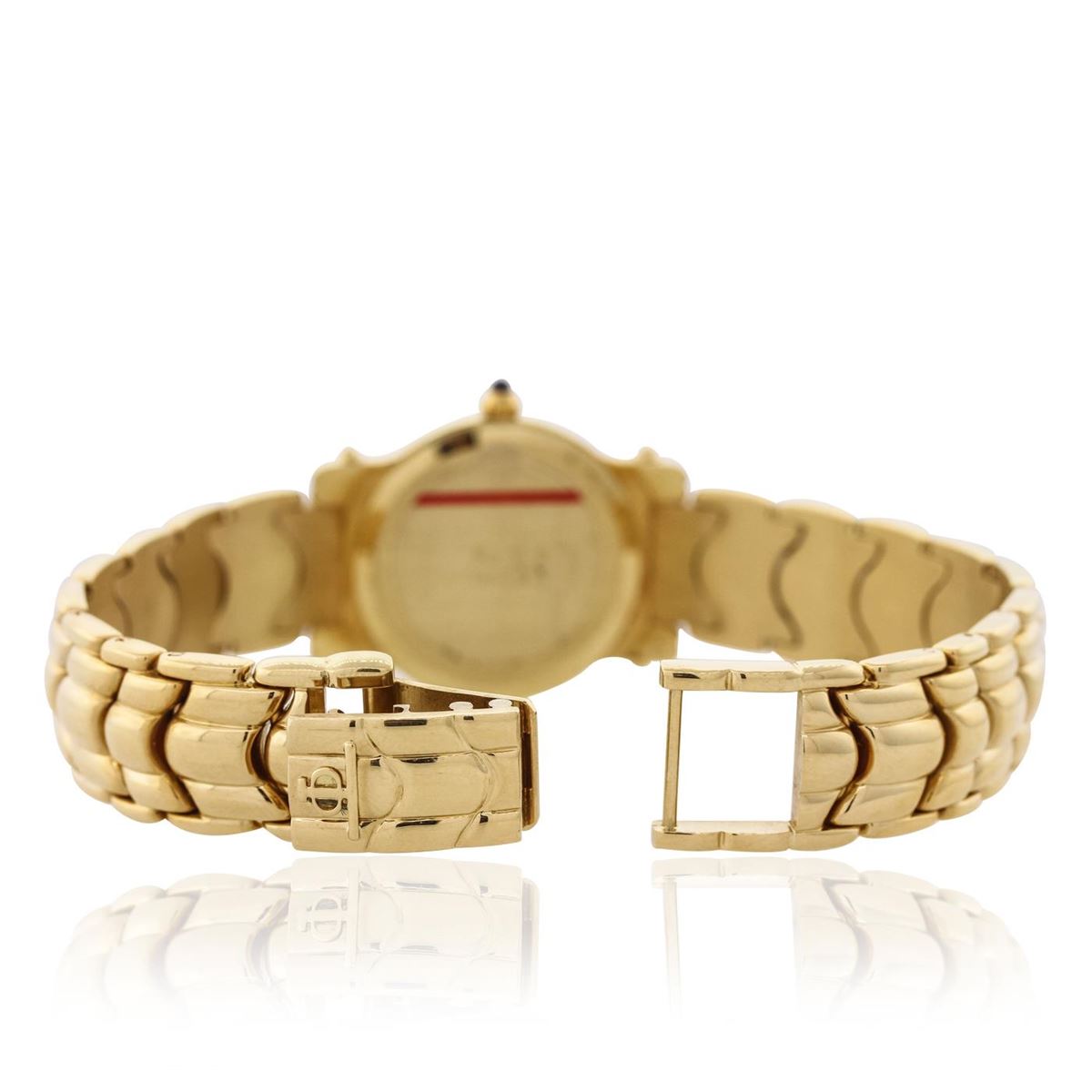 One ladies Baume & Mercier wristwatch featuring: 18KT yellow gold case and crown set with a blue crystal. Dial: White color, with pointed hands and Roman numerals. "Baume & Mercier" at the 12 o'clock position. Bracelet: 18KT yellow gold with adjustable clasp.